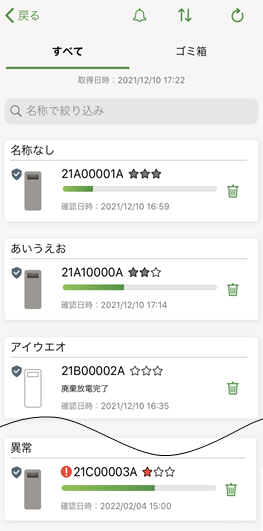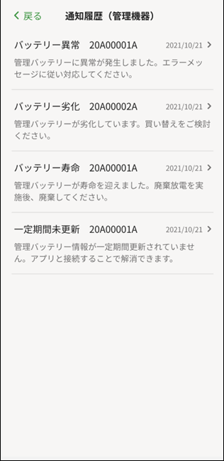ホーム画面と同様に製造番号(9桁英数字)、バッテリー残量(インジケータ、11%以上:緑、10%以下:赤、0%:グレー)、バッテリー状態、及び管理用に設定したバッテリー名称を表示します。