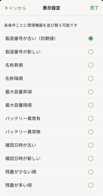 製造番号順、名称順、最大容量順、バッテリー異常順、確認日時順、残量順のいずれかから表示するバッテリーの並び順を選択します。(初期:製造番号が古い順)