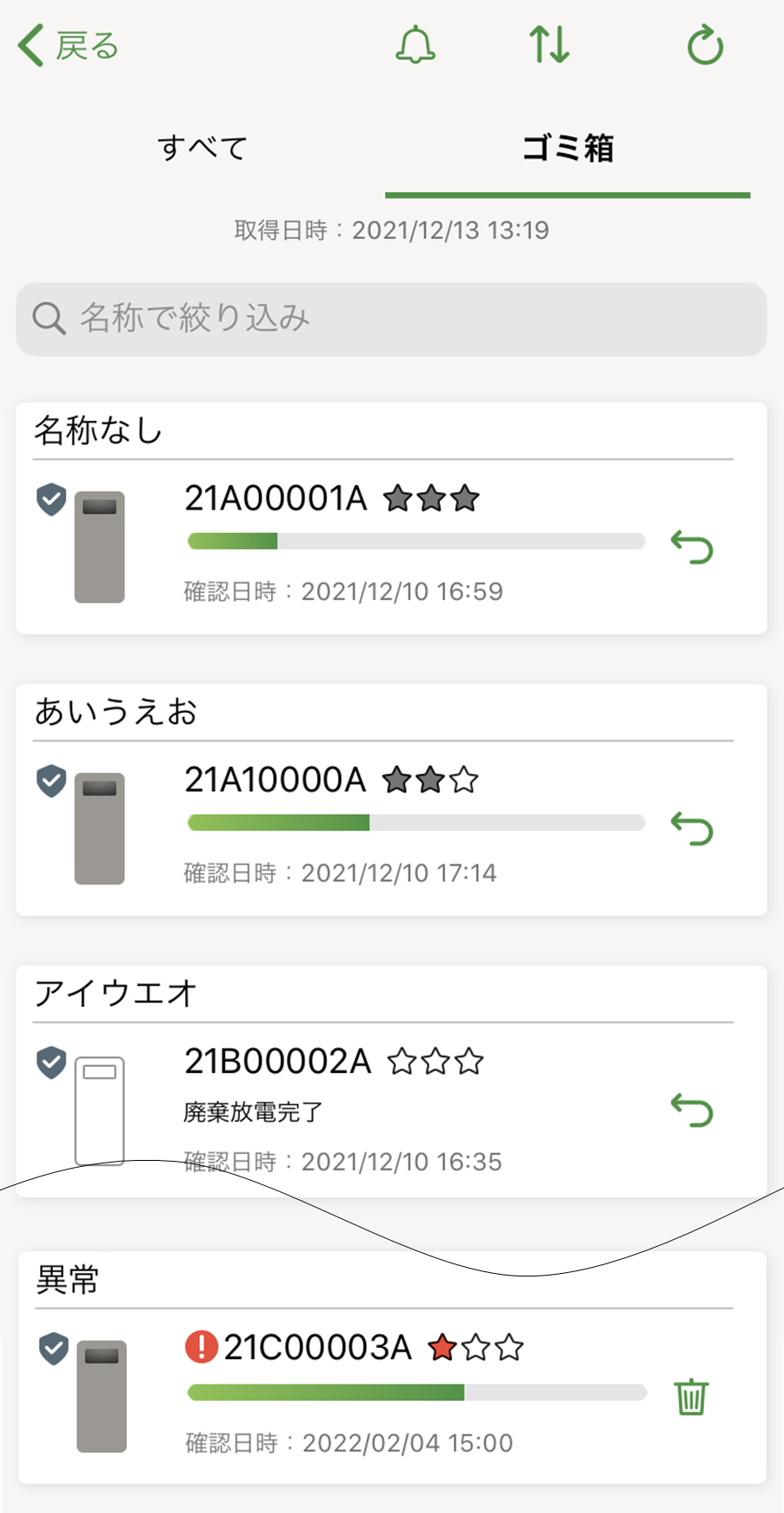 | 管理機器情報「ゴミ箱」一覧から選択したバッテリー情報(サーバー)を「すべて」に戻します。 |