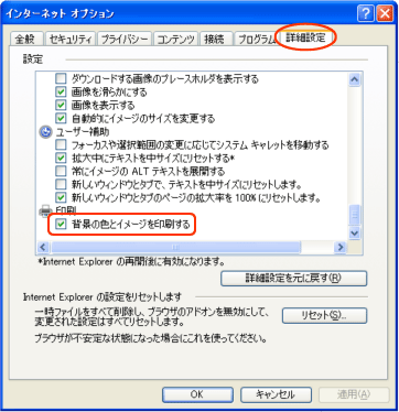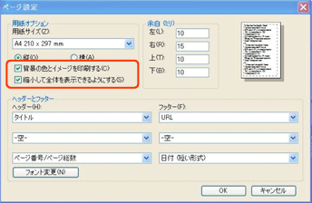 ←用紙オプション設定をします。 ※背景の色とイメージを印刷するにチェックを入れると表組みの罫線表示ができます。 ※縮小して全体が表示できるようにするにチェックを入れる。