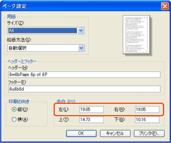 メニューバーの[ファイル] より [ページ設定] で下記のダイヤログボックスが表示されます。