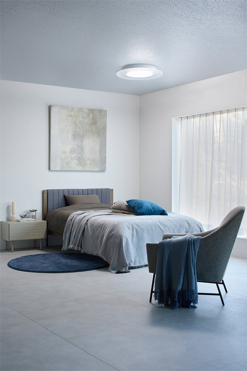 寝室にエアパネルLEDを設置して「おめざめモード」を使えば、日の出のようなあかりとともにさわやかな朝のお目覚め環境をサポート。時間の経過とともに徐々に光が明るくなり、おやすみからお目覚めまで、寝室環境をサポートします。カーテンを閉めて就寝すると朝の光を感じにくいので、特におすすめです。