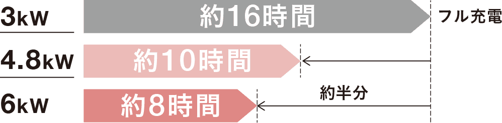 従来、充電出力をあげる場合は6kWタイプの選択しかありませんでしたが、その場合だと工事費用が高くなります。4.8kWタイプの場合、工事費用を抑えて、充電が便利かつ充電時間を短縮する事が可能です。