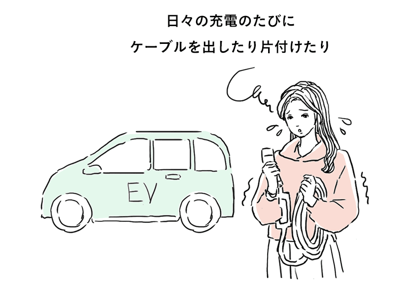 ただ、 EV充電用コンセントの場合、充電出力が3kWになるため、「朝までに満タンにしたいのに時間がかかる」「もっと充電スピードを上げたい」というお悩みが出ることも多くあります。また、ケーブルを充電のたびに出したり片づけたりするのも、実際には大変です。意外に重いんですよね…。