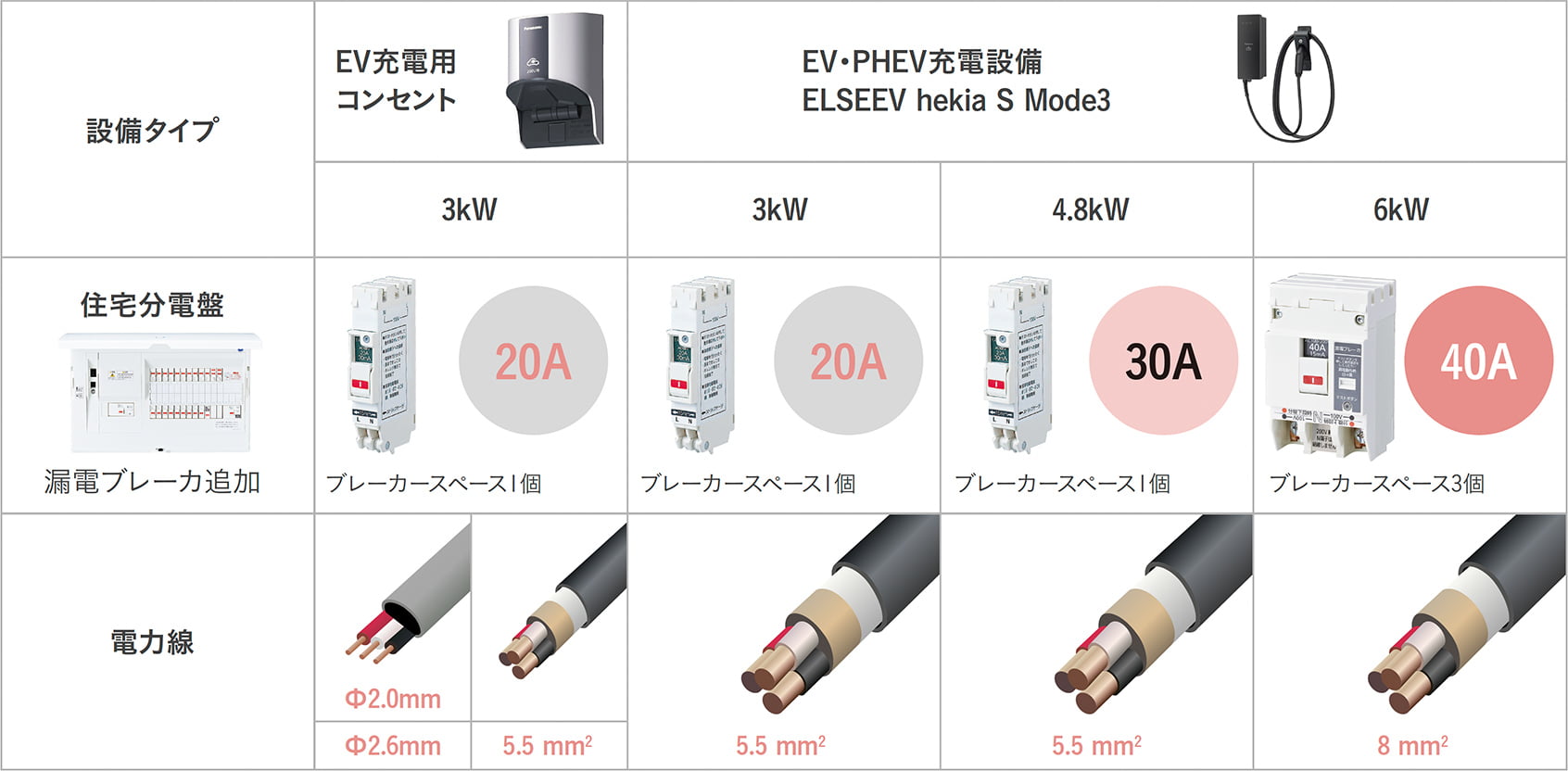 コンセントタイプ(3kW)においては、一般的にΦ2.0㎜の電線で配線されることが多いのですが、あらかじめΦ2.6㎜もしくは5.5㎟の太さで配線しておくことで、容量アップ時の交換作業をスムーズに行うことができます。