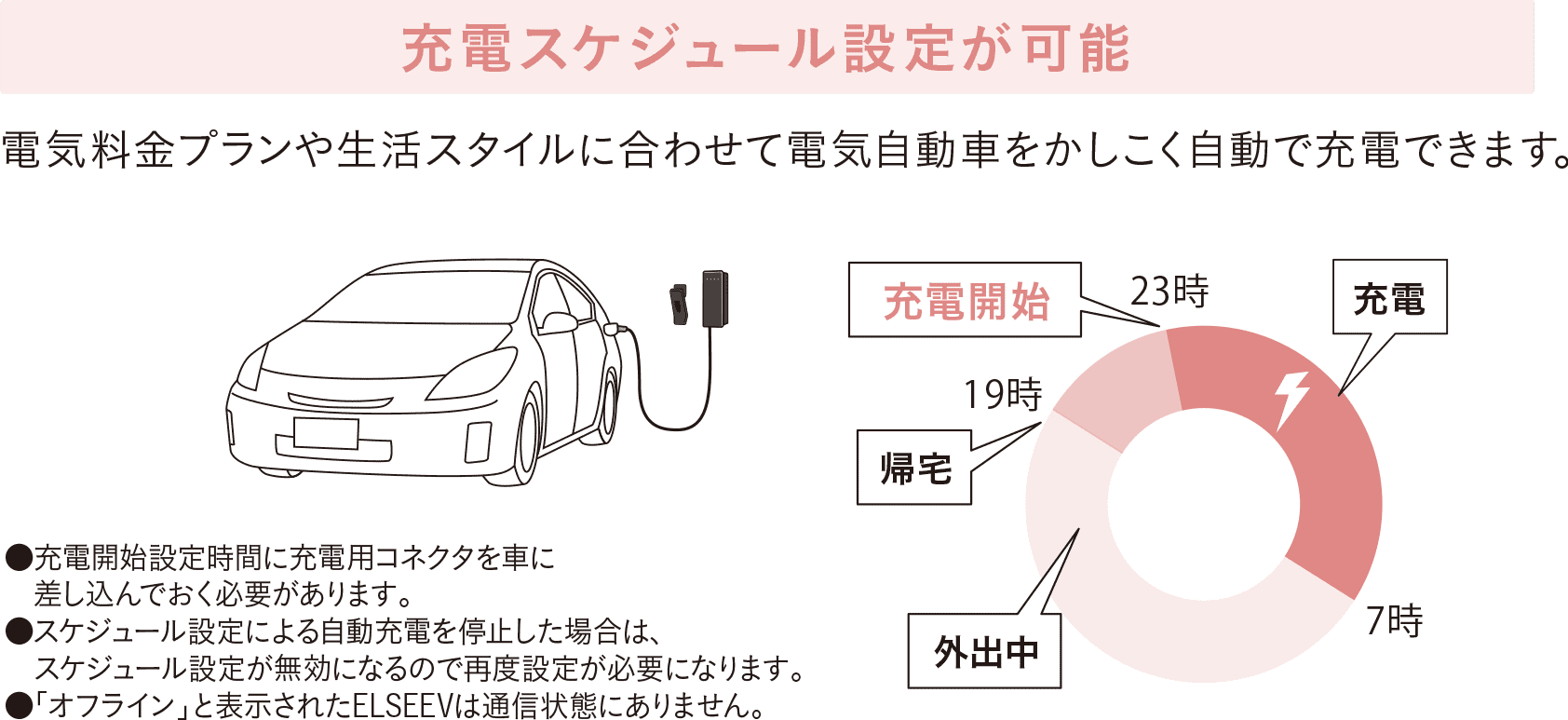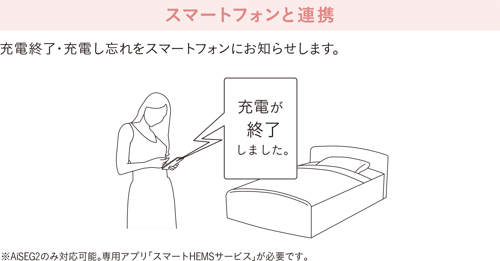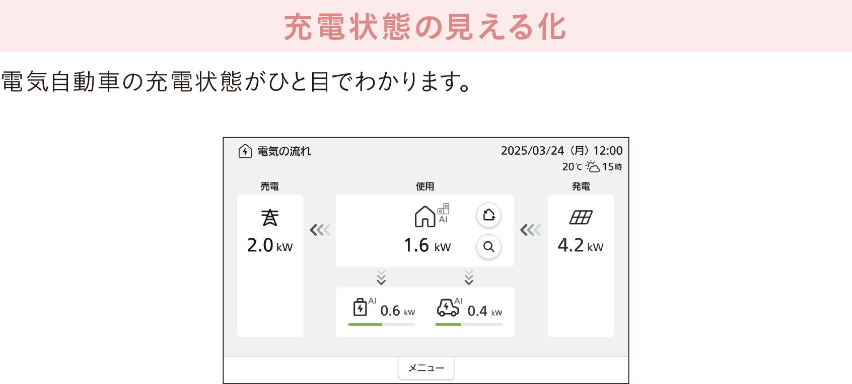 例えば、特集「忙しい日々の頼れるパートナー」でご紹介した、パナソニックのホームエネルギーマネジメントシステム「AiSEG」との連携もできるため、充電状態が見えたり、充電のスケジュール設定ができたり、毎日の忙しいくらしの中で充電作業をサポートすることが可能です!