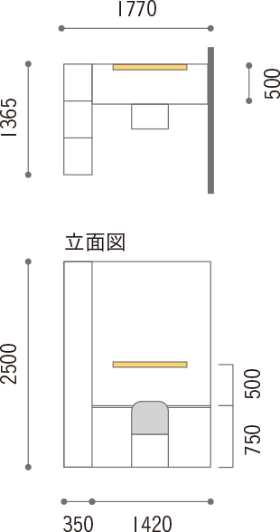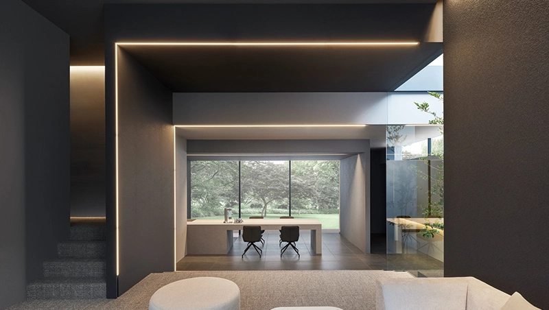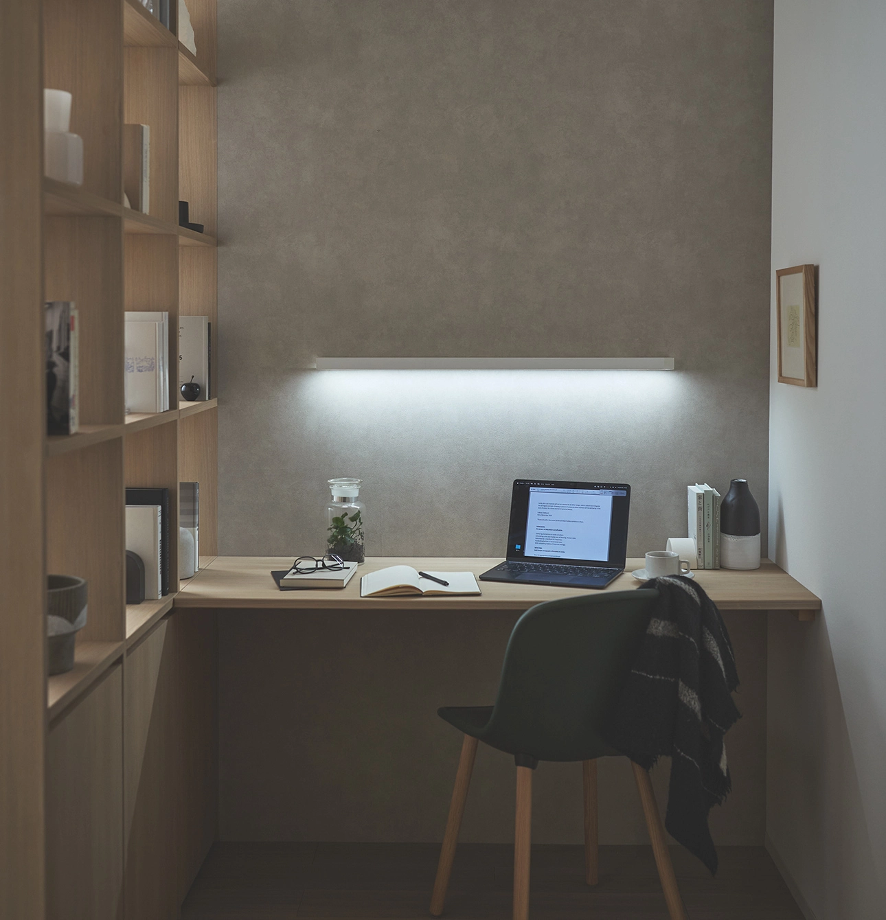 発光部を一面だけ残し、造作がなくても、コーブ照明やコーニス照明を空間に取り入れられます。ワークスペースの壁面に直付け取付することで、タスク照明にも。