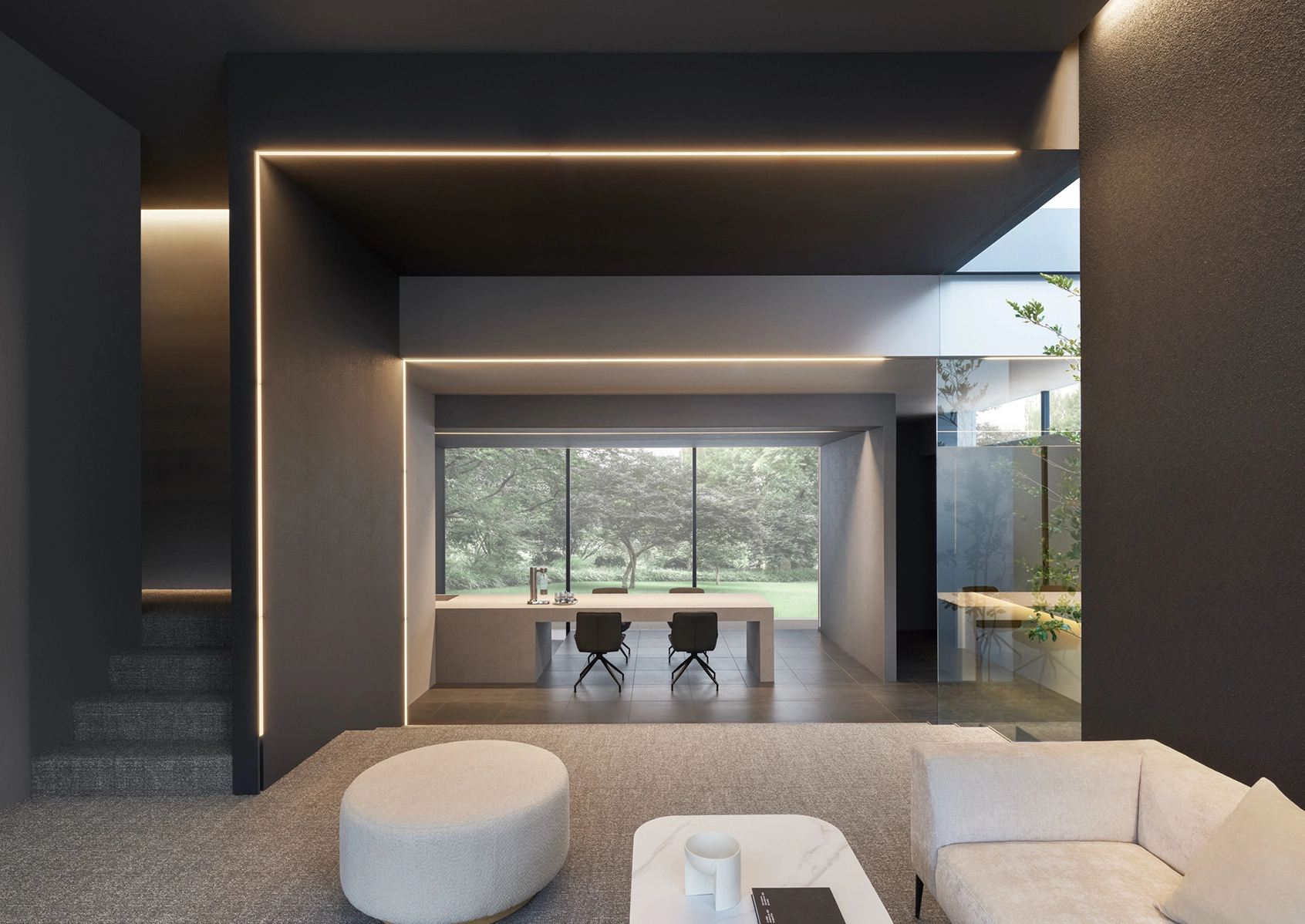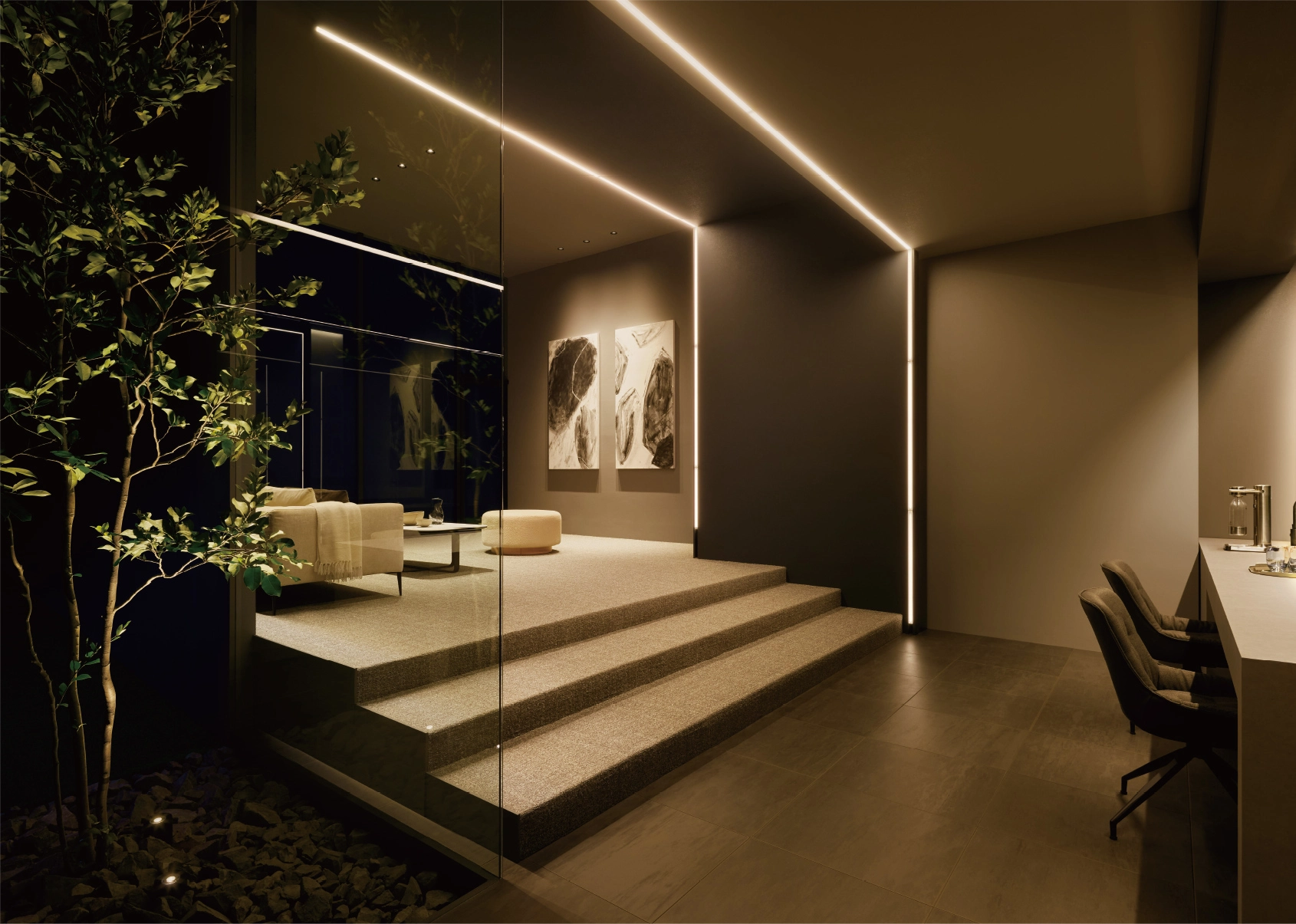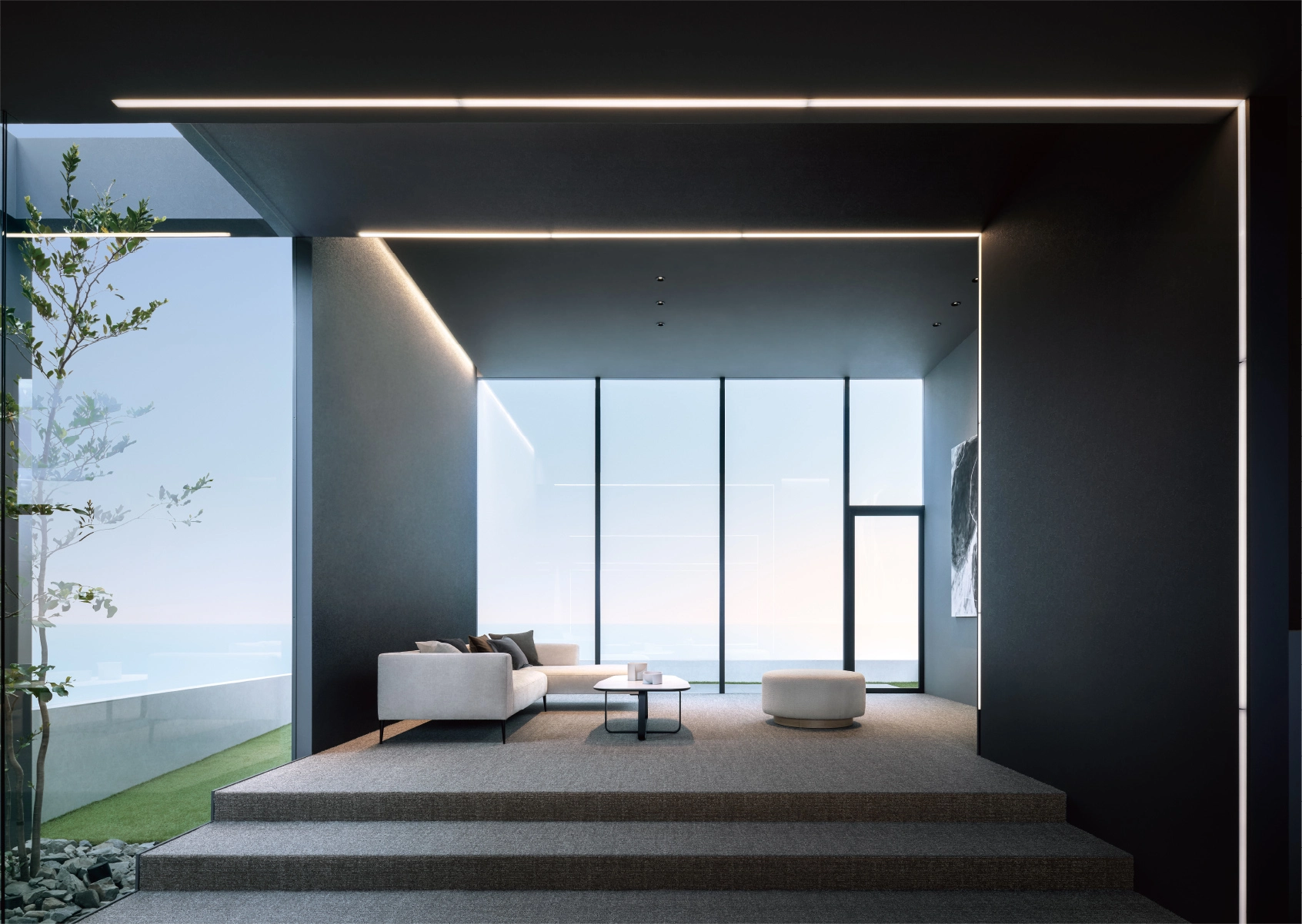 ネジなどの要素を表に出さず、構成を極限までそぎ落とし、ミニマルなフォルムに仕上げています。さらに、LEDの粒感を抑えた滑らかな発光面により、光そのものが建築の一部となるような上質さを実現しました。