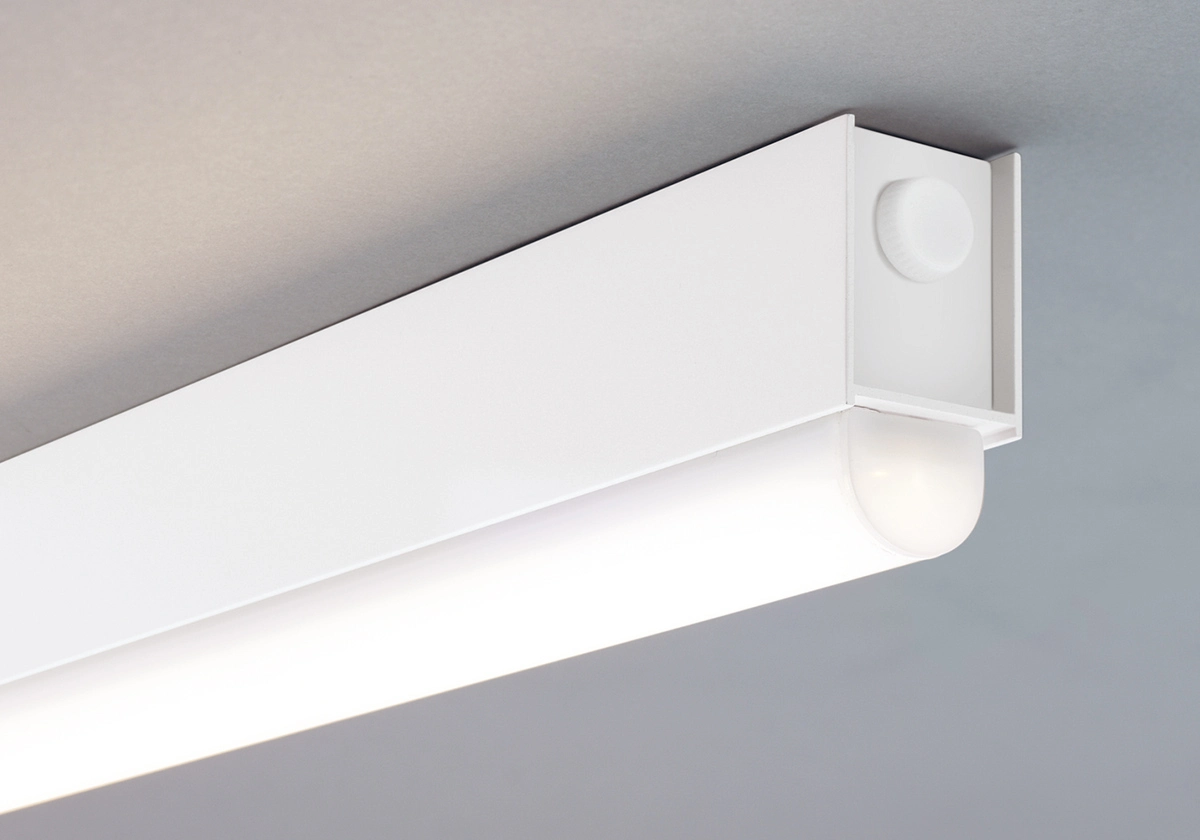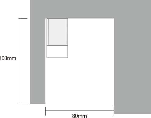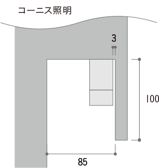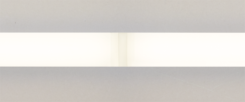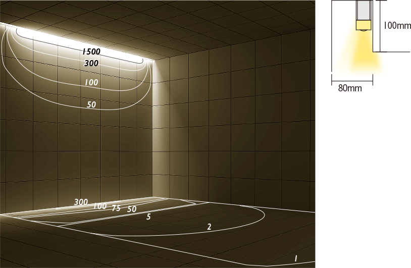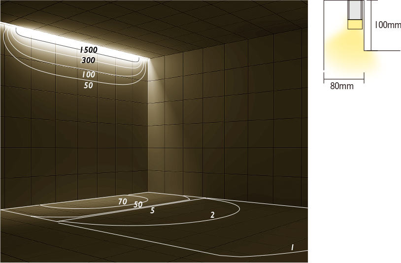 これまでの間接照明では、たとえばコーブ照明やコーニス照明で使用する際、側面に10mm、両端に100mmのスペースが必要でした。