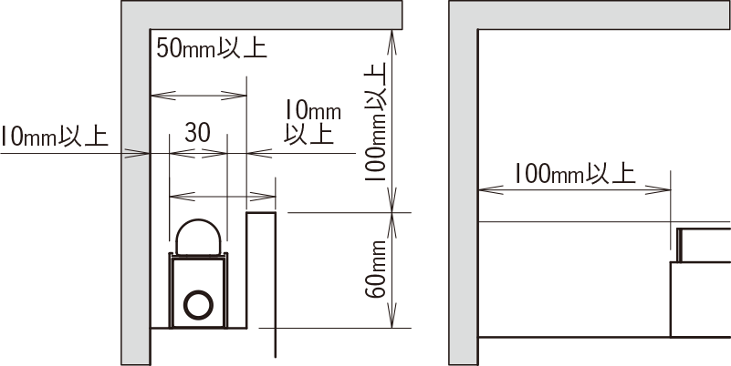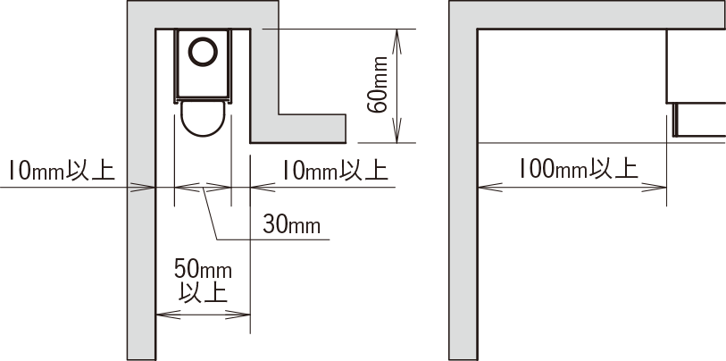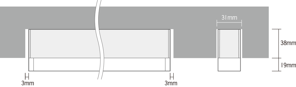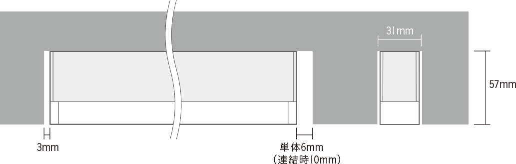 今回の新商品では、天井や壁への埋め込み時にも、側面は片側わずか1mm、両端も(単体取付の場合で)片側3mmもう片側6mmのスペースを空けるだけで納まる設計を実現しました。