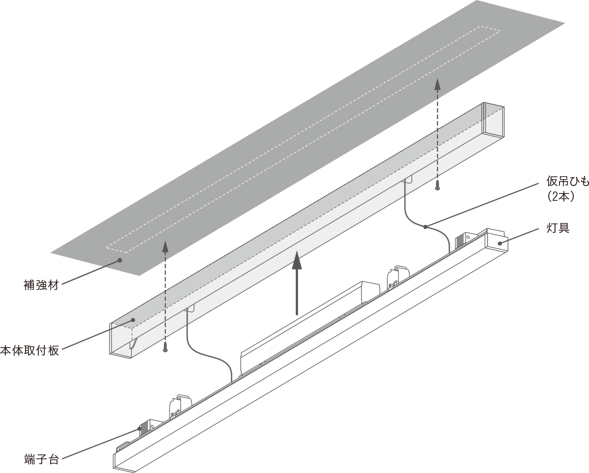 本体兼用取付板をあらかじめネジ止めし、そこに光源ユニットをバネ式で押し込むだけというシンプルな施工方法のため、現場での作業効率アップにも大きく貢献します。