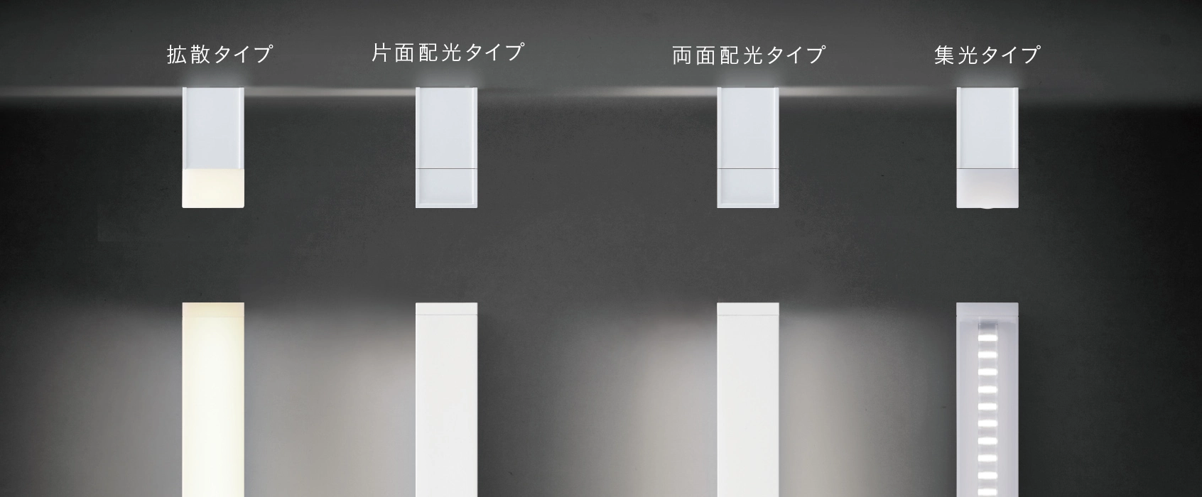 新商品では、「拡散・片面配光・両面配光・集光」の4種類を、全て同一のスクエア形状で展開。配光が異なる器具を一つの空間内で組み合わせて使っても、器具の形状や意匠にばらつきが出ないため、空間全体に高い統一感が生まれます。