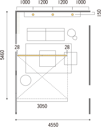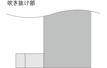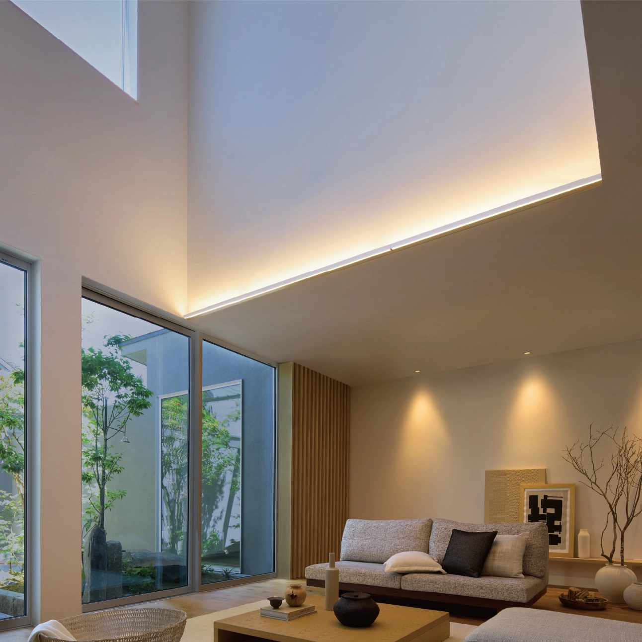 器具正面を遮光。まぶしさに配慮しながら、設置した天井や壁面に光を広げ、明るさ感を確保します。吹抜空間が印象的なリビングの事例では、天井高さが切り替わる角に合わせて直付け施工。上方へのあかりは「アッパーライト」として上部壁面を照らすことで吹き抜けの高さ感をだし、下方へのあかりは、「リビング空間の明るさ」を確保。天井のダウンライトの数を減らしすっきりとまとまった空間になります。