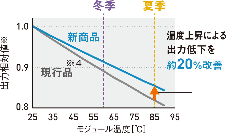 さらに注目なのは、「出力温度係数」が-0.26%/℃※3と優秀な数値を誇ること。