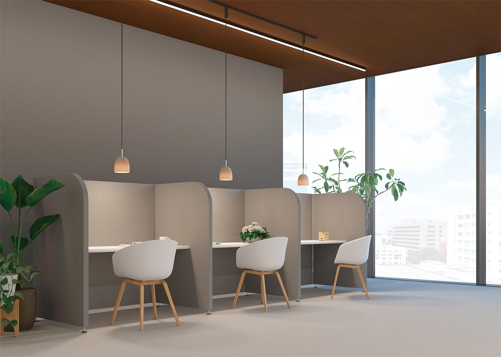 オープンな空間に連灯することで、リズム感を生み出しています。デザイン性だけでなく、机上面の照度もしっかり確保できます。