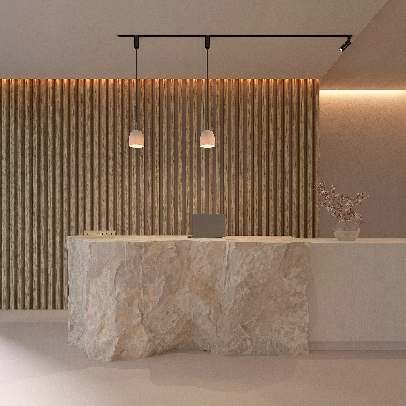 来客を迎えるレセプションに、ミスティホワイトでクリーンな印象を。
