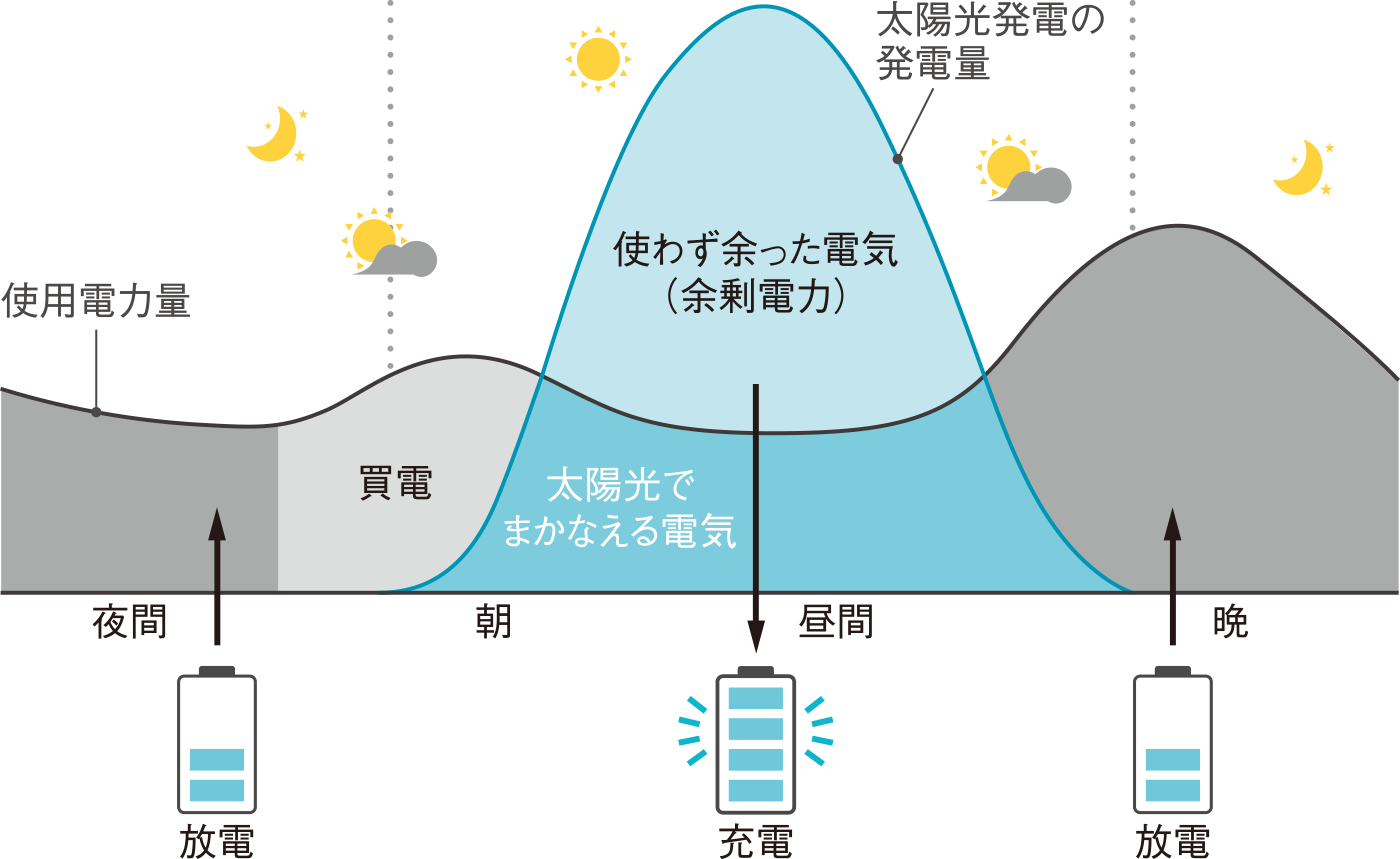近年、太陽光パネルの導入を検討する方が増えていますが、日中に発電した電気はその場で使い切れないと、電力会社へ売るしかありません。そんな時に蓄電池があれば、その余った電力を蓄えることができ、夜間に使うことで、買う電気を減らせるんですね。