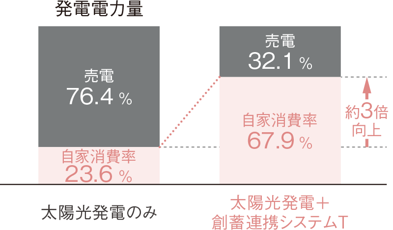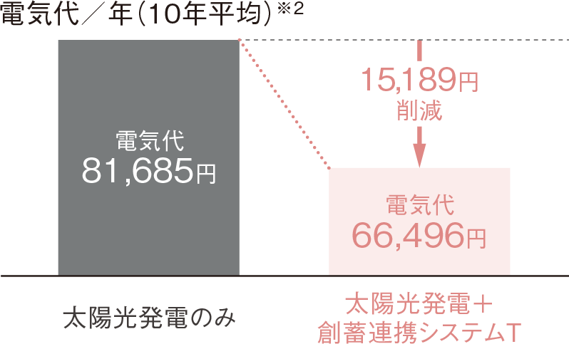 - 太陽光発電のみ搭載と、太陽光発電に創蓄連携システムTを搭載した場合との比較。 太陽光のみ搭載の場合:自家消費率は23.6%、電気代/年は81,685円 創蓄連携システムTを搭載した場合:自家消費率は67.9%、電気代/年は66,496円 【試算条件】地域情報:東京(東京電力)、お客様情報:4人世帯、オール電化プラン(スマートライフL)、売電単価:24円(1-4年目)・8.3円(5-10年目)、機器情報:太陽光発電:5.5kW、年間発電量:5,887kWh/年、創蓄連携システムT 蓄電池容量:9.7kWh、運転モード:自家消費モード、放電下限値0%、エコキュート:ヒートポンプ有り、年間電気使用量:5,112kWh(出典元:建築研究所)当社試算によるシミュレーション値であり保証値ではありません。太陽光の発電状況、電力消費量等によっては、削減効果が下回る場合があります。