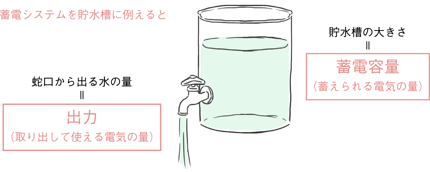 蓄電池を貯水槽に例えるなら、蓄電容量は「蓄えられる水の量」、自立出力は「蛇口からでる水の量」にあたります。蛇口からでる水の量が少なければ、水が充分にあっても一度に使える量は限られてしまいますよね。