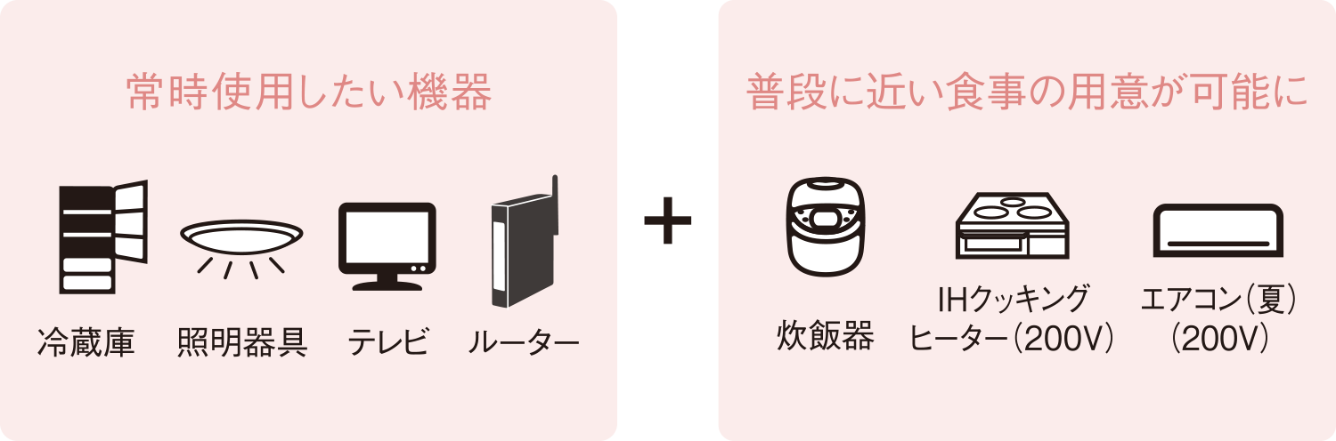 非常時であっても調理機器や空調が使えることで、「普段に近いくらし」に近づき、もしもの安心感につながりますよね。