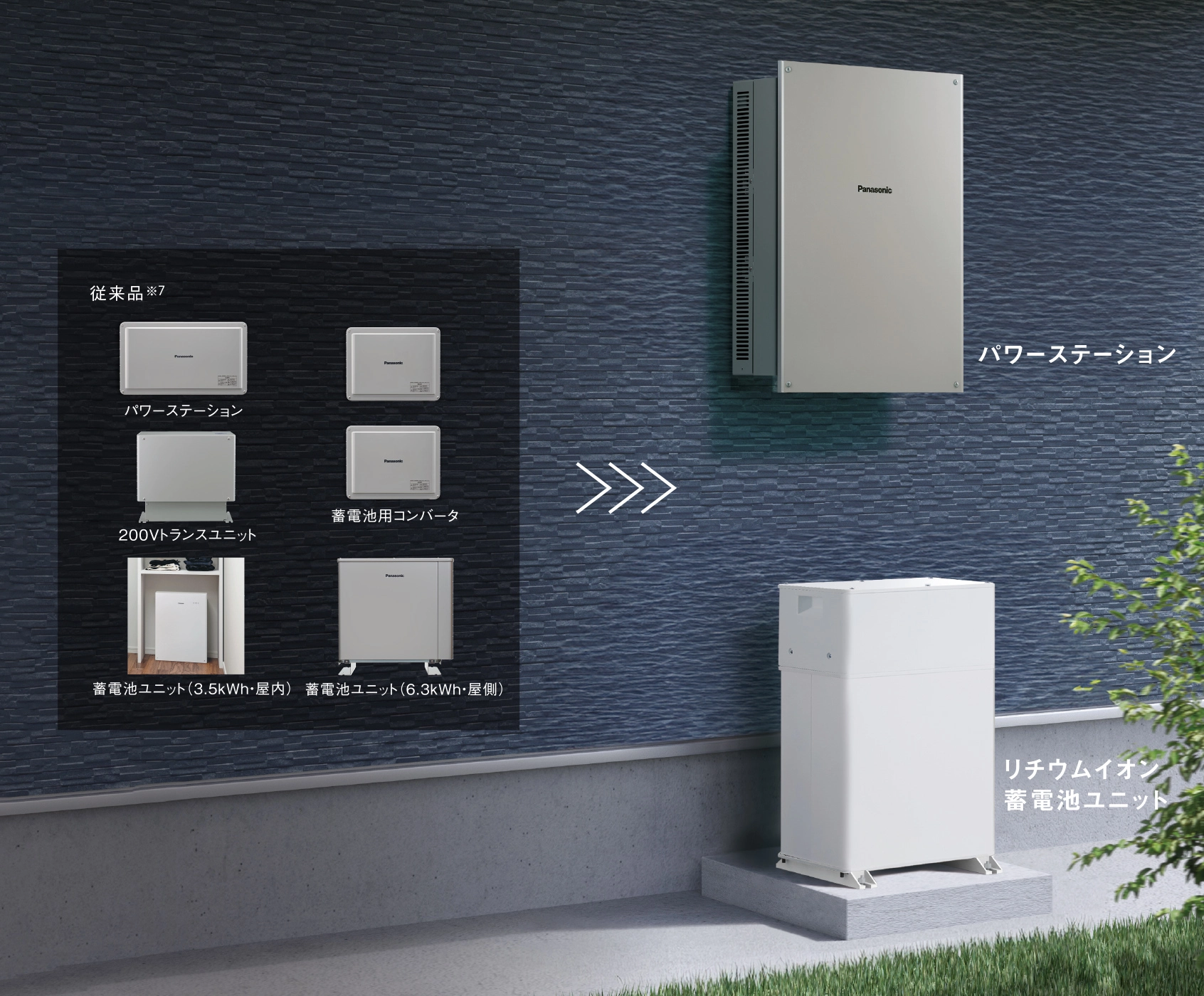 - 2019年発売創蓄連携システムS+と比較した場合、壁付け設置に必要な面積が52%削減、奥行きは49%削減。創蓄連携システムT 蓄電容量9.7kWh(全回路構成):パワーステーション(5.5kW・一般/耐塩)×1台、 創蓄連携システムS+ 蓄電容量9.8kWh(全回路構成):パワーステーションS+(本体)(5.5kW・一般)×1台、パワーステーションS+(蓄電池用コンバータ)×2台、200Vトランスユニット(パワーステーションS+用・4kVA・据置)×1台