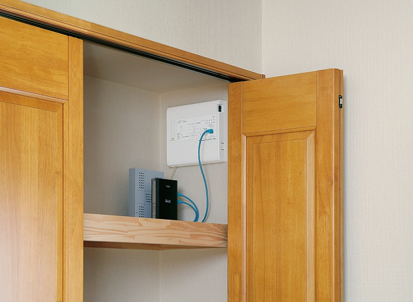 LANは4系統に分岐でき、書斎や子ども部屋など複数の部屋を有線でつなぐことができます。ケーブル自体は壁の中に配線でき、表に露出しないのでインテリアの美観を守ります。