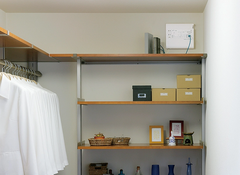 一方ですまいでは、ルーターやモジュラジャックまわりの配線が煩雑になりやすく、空間の中で扱いづらい存在になりがちでした。機器が増えるほど見た目は雑然とし、設置場所も限られてしまいます。収納内に収めれば外観は整いますが、Wi-Fiの電波が弱くなるという課題もあります。