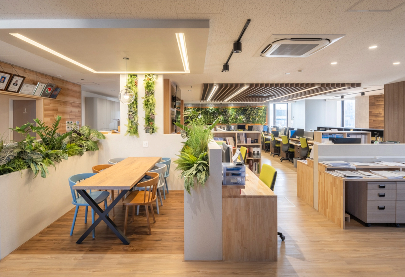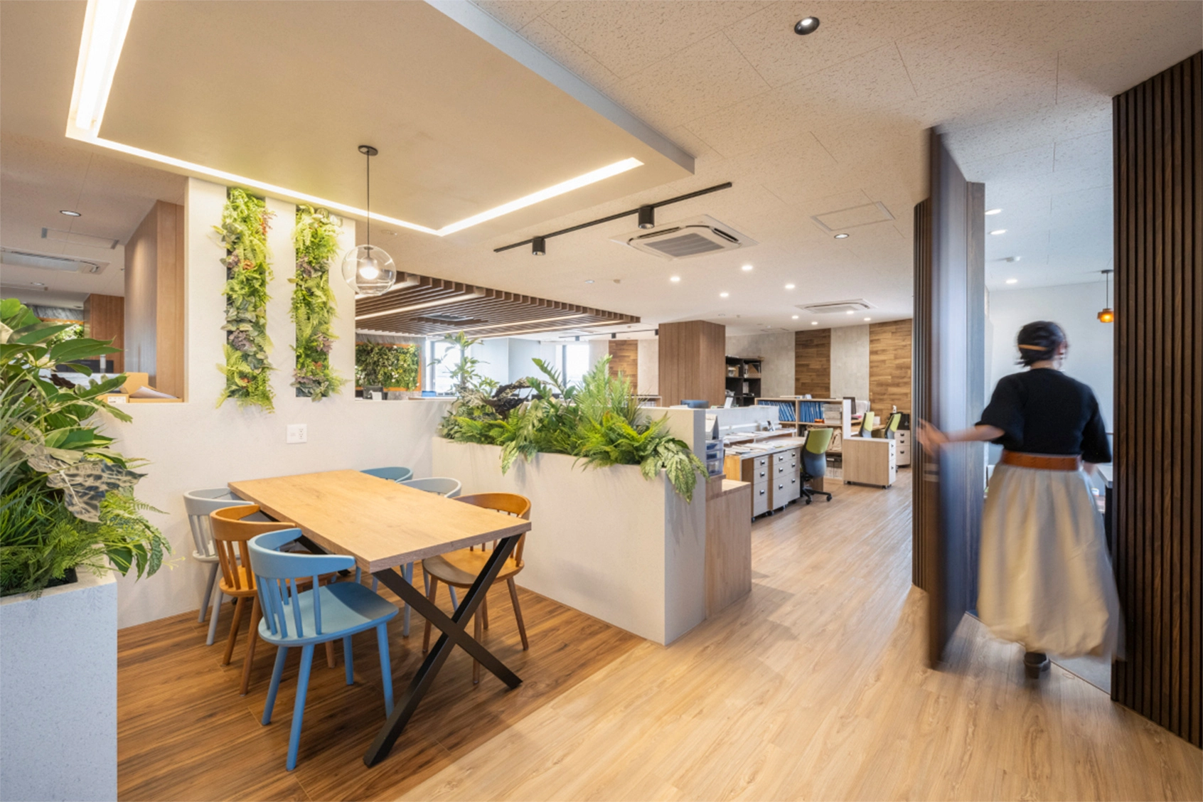 結果として、グリーンを豊富に取り入れた明るい雰囲気の空間となり、来訪者だけでなく、日々働く社員の皆様からも好評を得ているそうです。