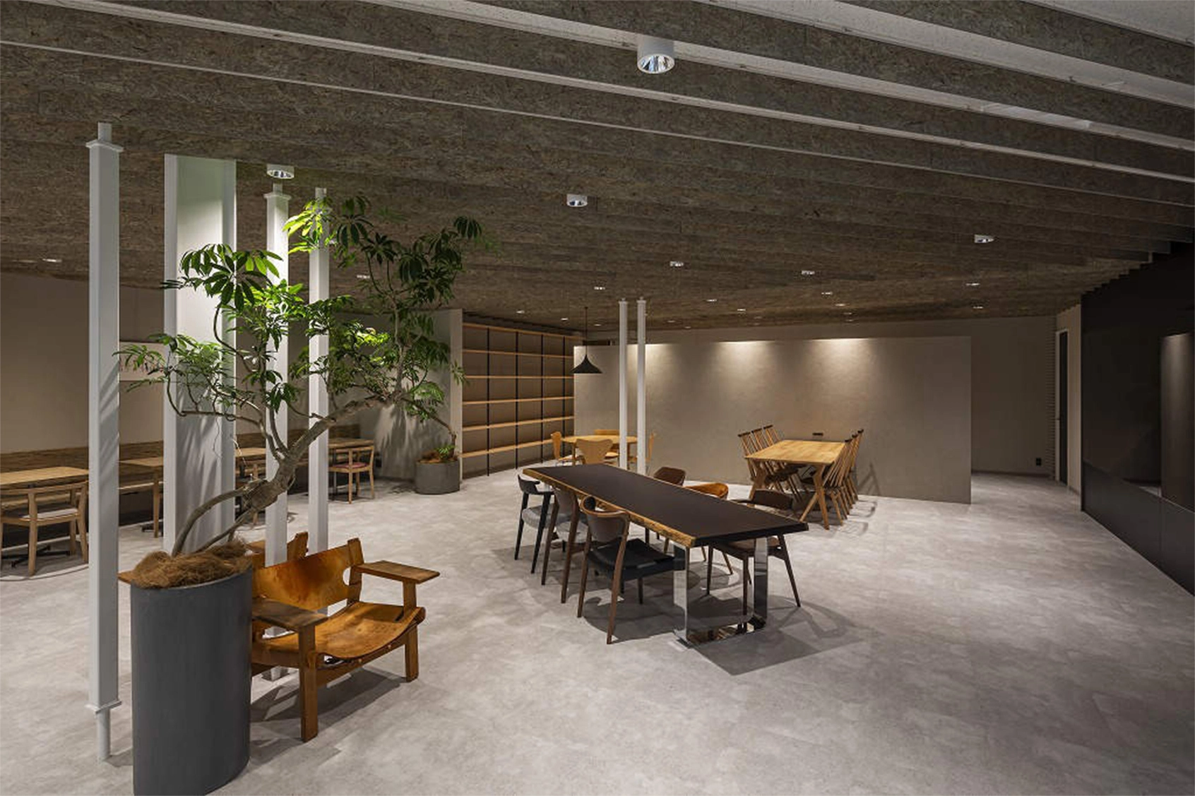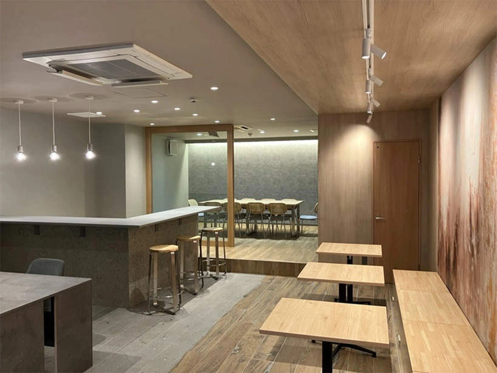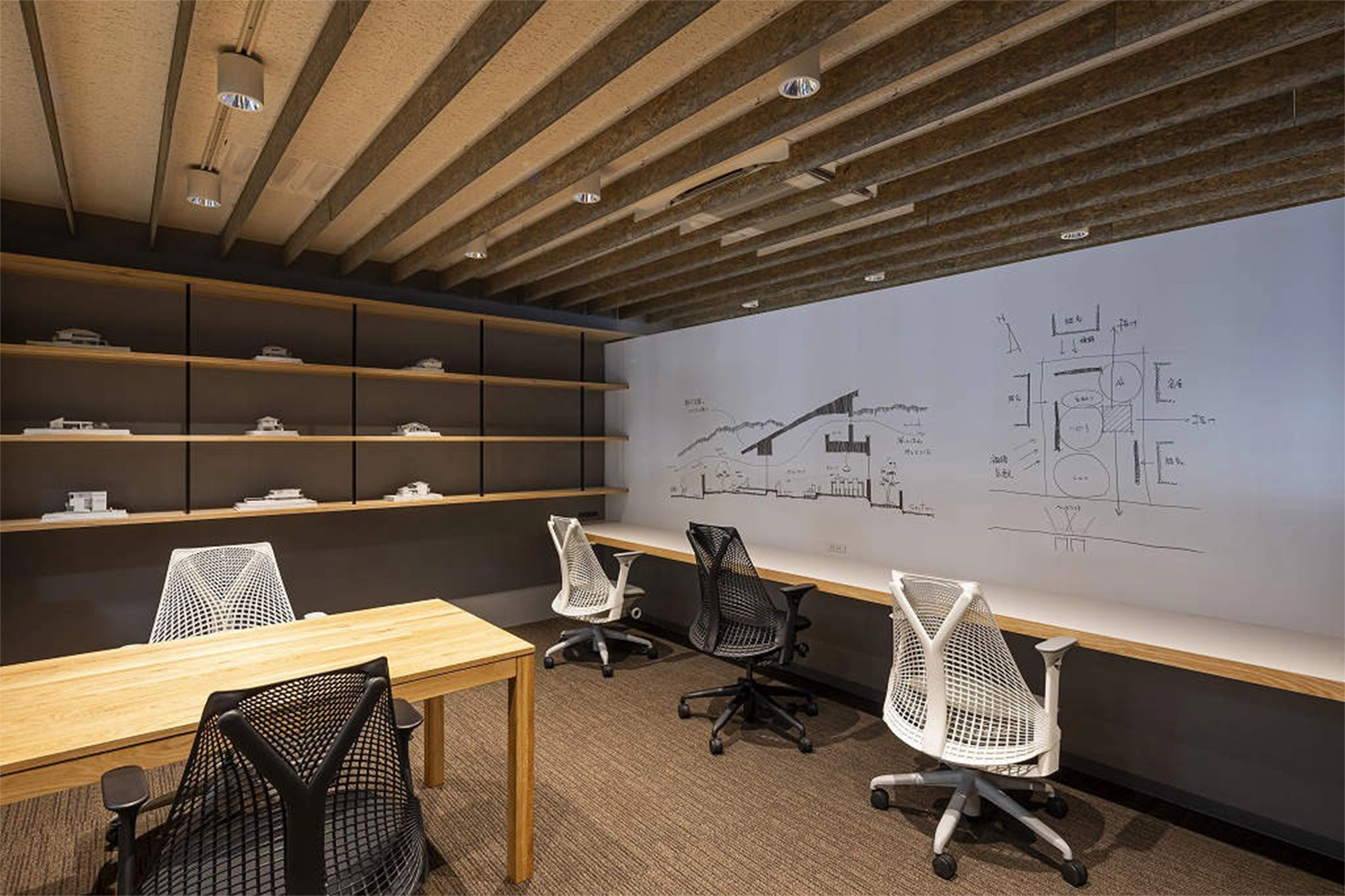 会議室でありながら、木のテーブルと温白色のあかりで温かみのあるある空間に仕上げています。