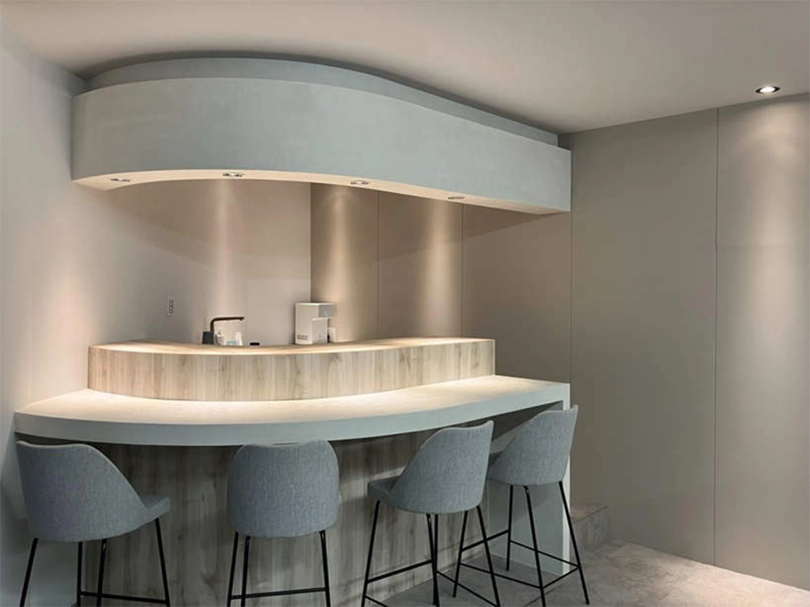 テーブル面にあかりだまりを作ることで、オフィス空間内であっても、リラックスできるカウンター席に。壁面に陰影をつけた配光でバーの様な雰囲気を演出しています。