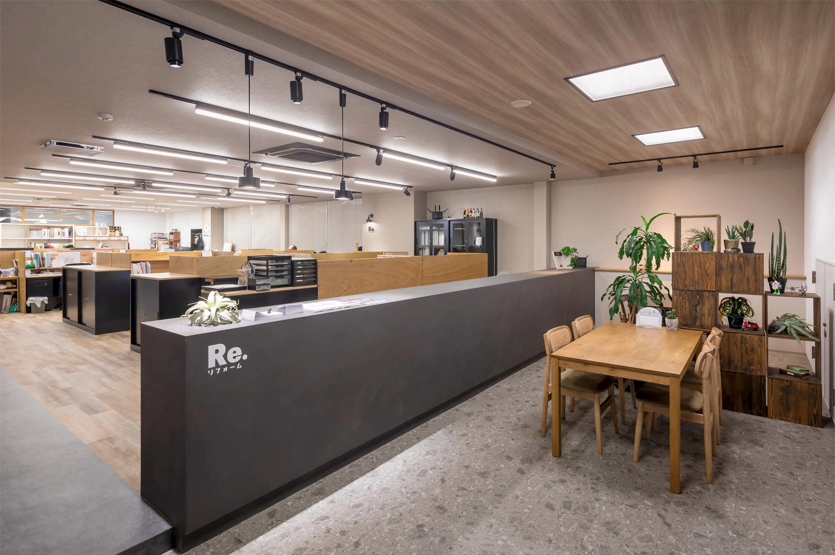 株式会社大之木ダイモ様は、2024年8月に本社オフィス、ショールーム、ホームセンターのリニューアルを実施されました。こちらの画像は、2階オフィスの執務スペースです。黒のダクトレールに、スリムなベースライト「sBシリーズ」やスポットライト「TOLSOシリーズ BeAmFree」を組み合わせ、内装の雰囲気に調和した照明計画としています。