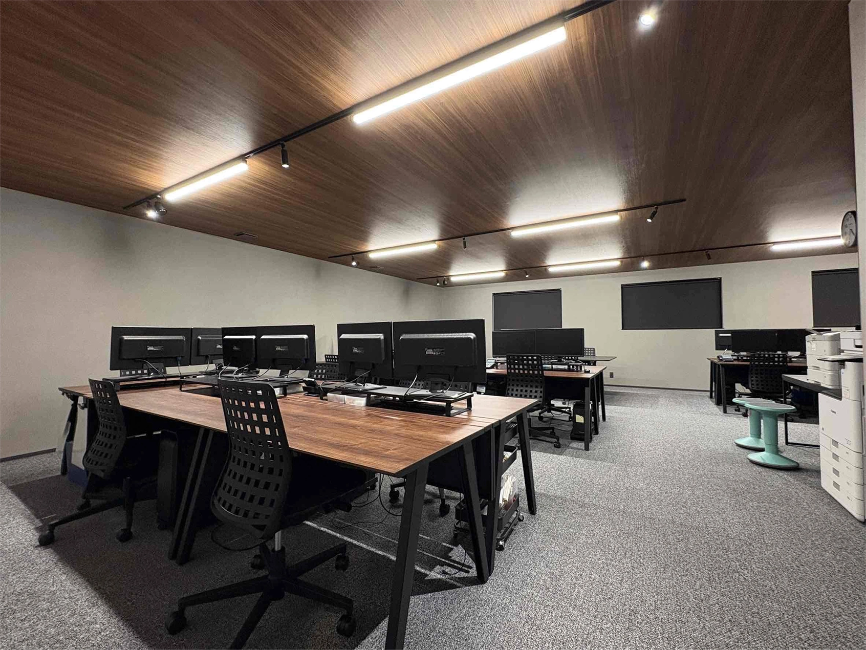 こちらのデザイン室は、ソロワークスペースを兼ねた空間です。ガラス張りにすることで、受付から室内の様子が見えるようになっています。照明には「メリハリ照明」を採用し、ルーバーの間に配線ダクトを設置。そのダクトに「小型シーリングライト」を組み合わせています。コンパクトでありながら高出力(200形・広角40°)の器具により、机上面の照度をしっかり確保しつつ、器具の存在感を抑えた落ち着きのある空間に仕上げています。