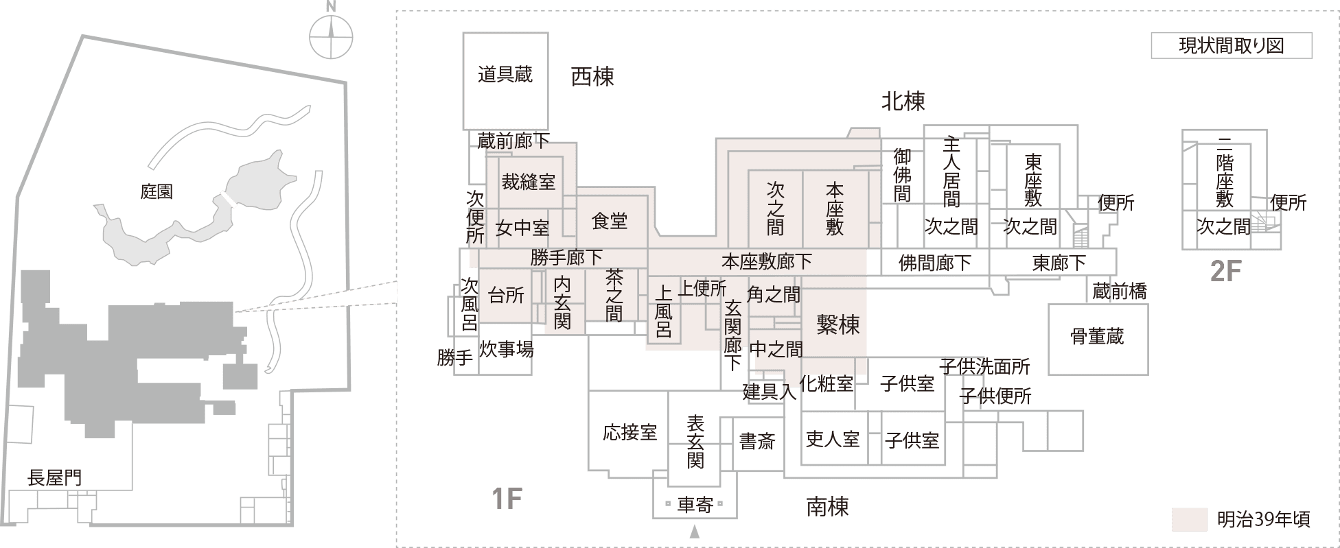 その後、昭和に入って福岡市の別邸から長屋門を移築。北棟南側を曳家して南棟につなげるなどの変更を行っている。伝右衛門は炭鉱主の印象から想像される豪壮な建物ではなく、細部にまで目の行き届いた上品な邸宅を建てており、建築技術や装飾など、その価値は高く評価されている。