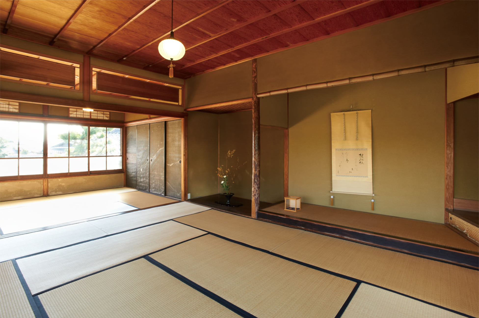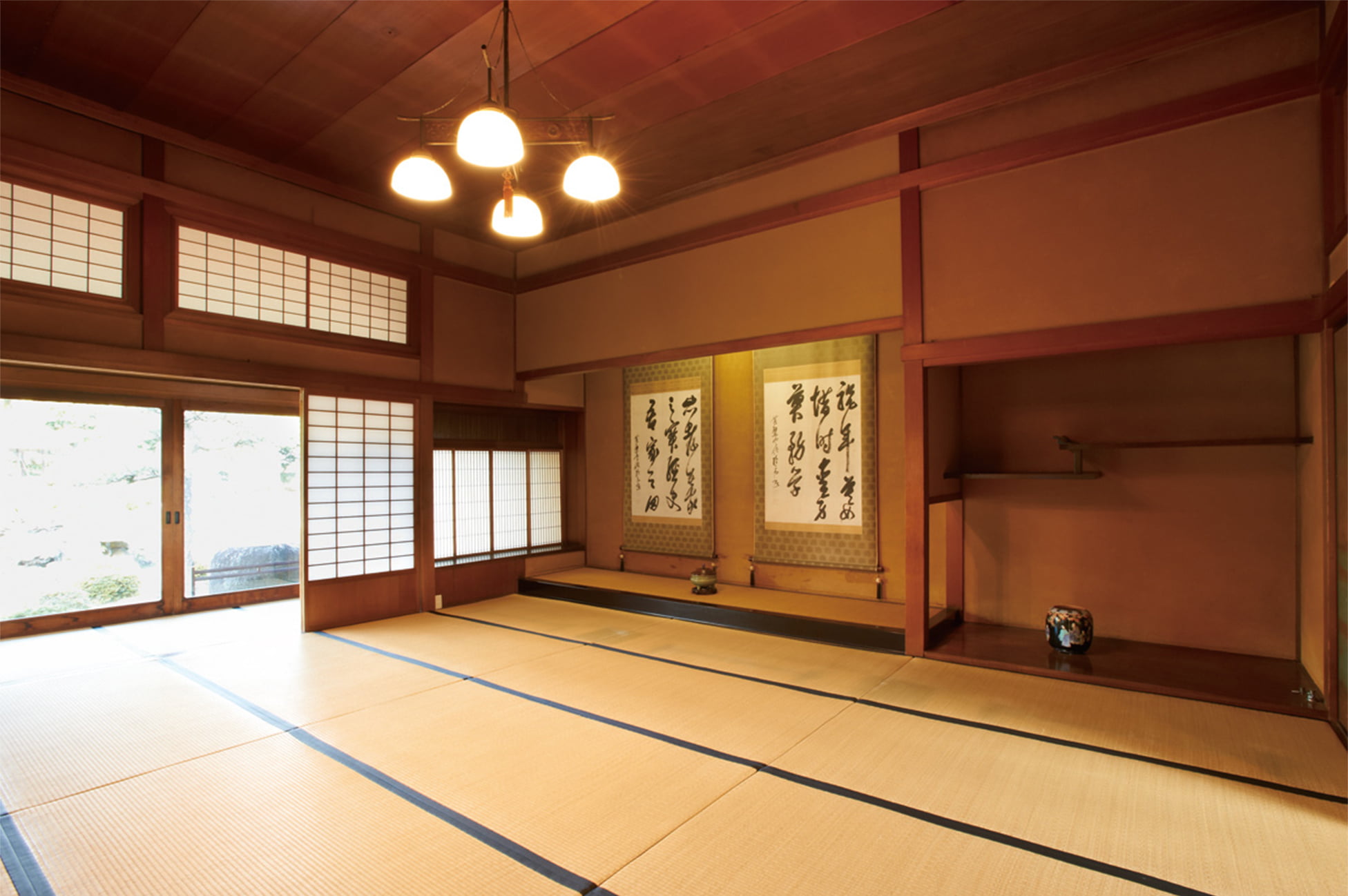 飯塚市幸袋の長崎街道沿いに伊藤伝右衛門邸が創建されたのは明治39(1906)年頃。社会は日露戦争による好況下で、貧しい暮らしから身を起こした伝右衛門は炭鉱事業を拡大、社会的に進出した頃であった。邸宅の本座敷は15畳、おさ欄間や四方柾目の床柱をしつらえた格式高い書院造りで12畳の次之間もあった。