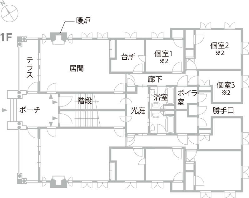 ※2. 個室1,2は寝室やゲストルームとして使用された。個室3は創建当初にはもっと狭く、使用人室だったが、増築して別の用途にも使われた。