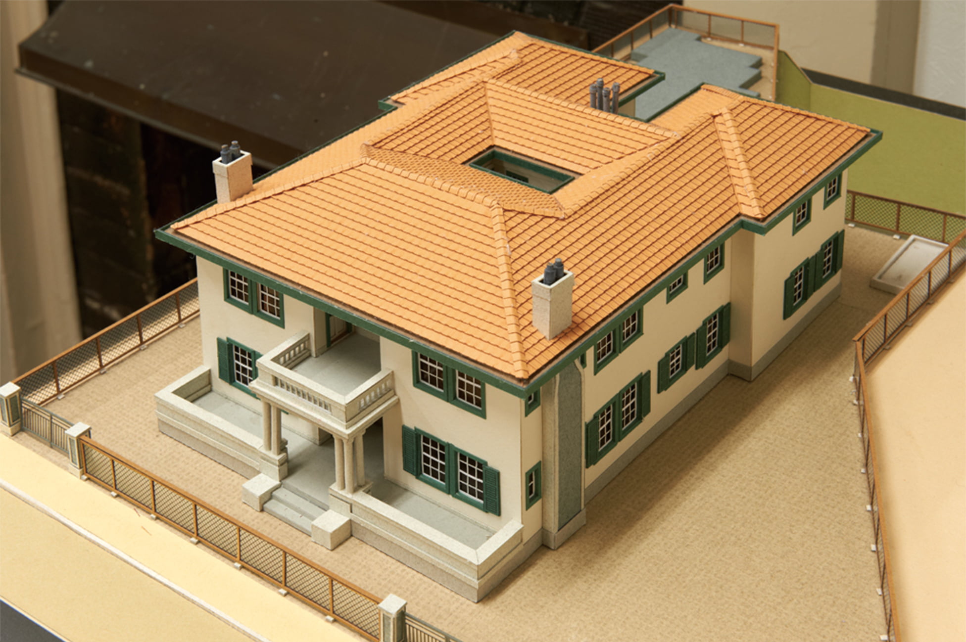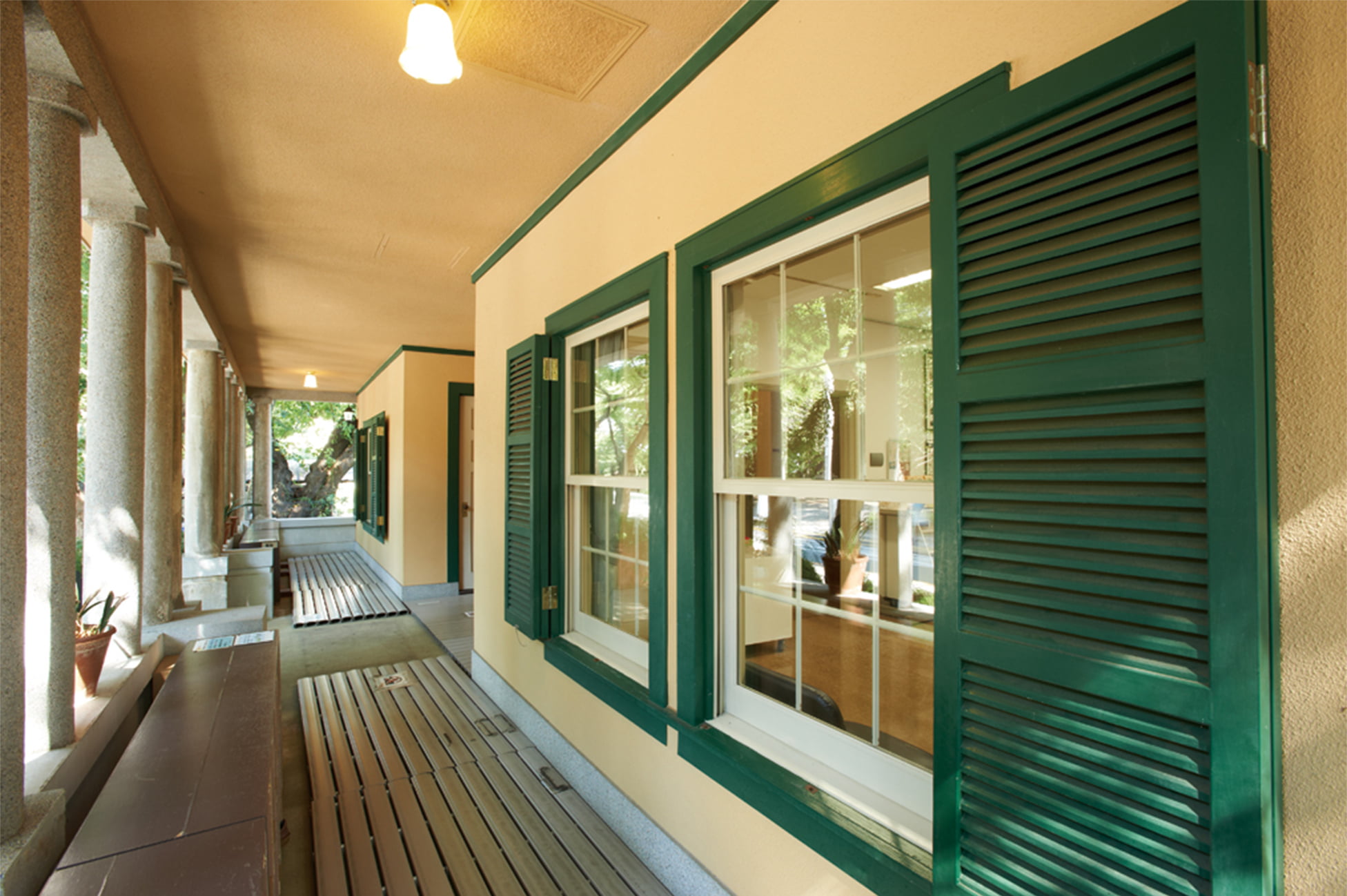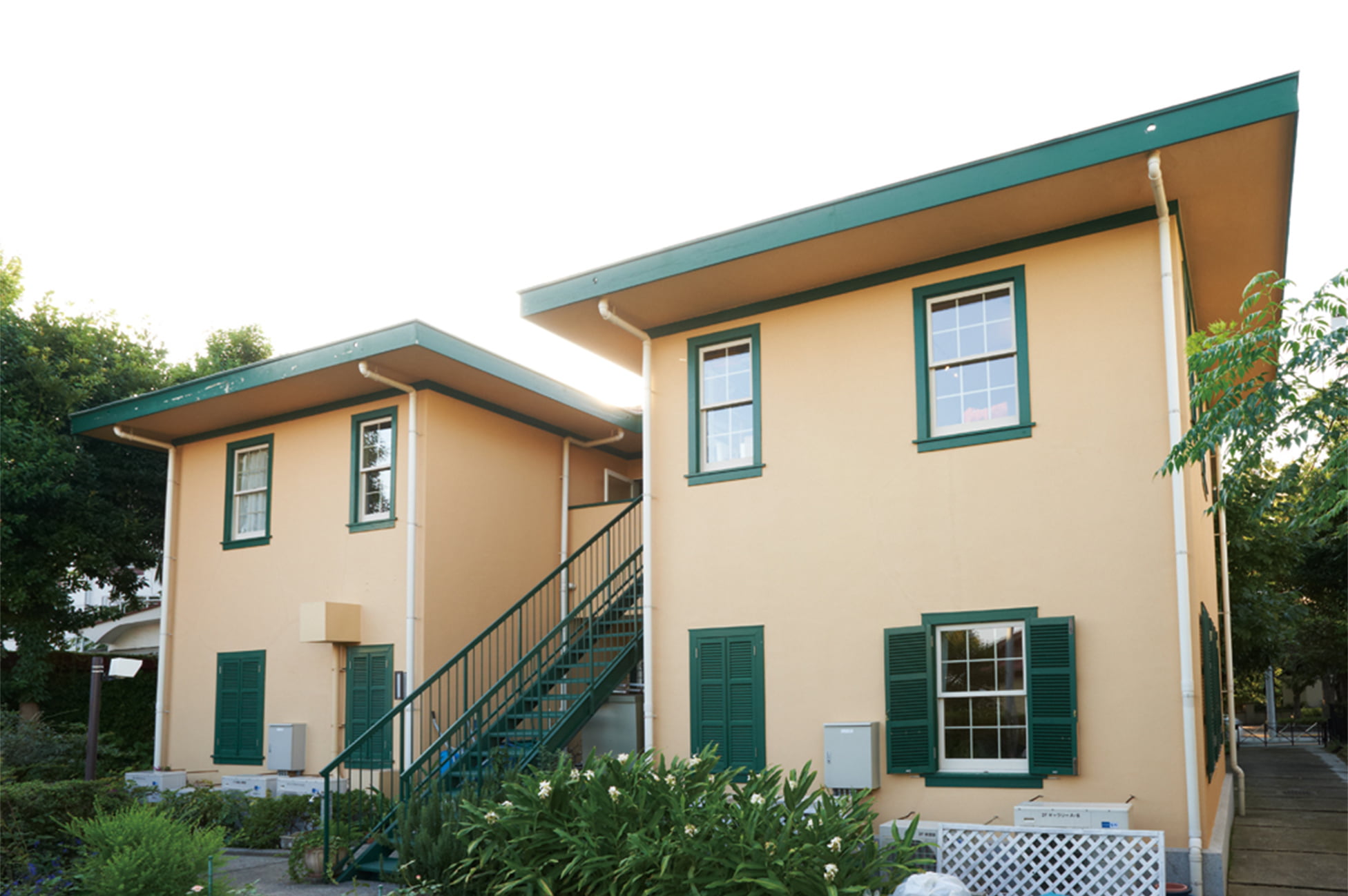 地震や火災に強いモルタル外壁や、軽量のセメント瓦を採用した木造2階建ての建物は日本人建築家※1の設計で、賃貸住宅ながらベランダの手すりやポーチの円柱にモダンなデザインを施している。上げ下げ窓やよろい戸、煙突も洋館らしいしつらえである。4戸は同じ間取りの3LDKで、約100㎡。当時の日本人の共同住宅の3倍ほどあったという。浴槽と洗面台、便器を1室に集めた浴室の造りや、使用人室の存在も外国人の生活様式をしのばせる。