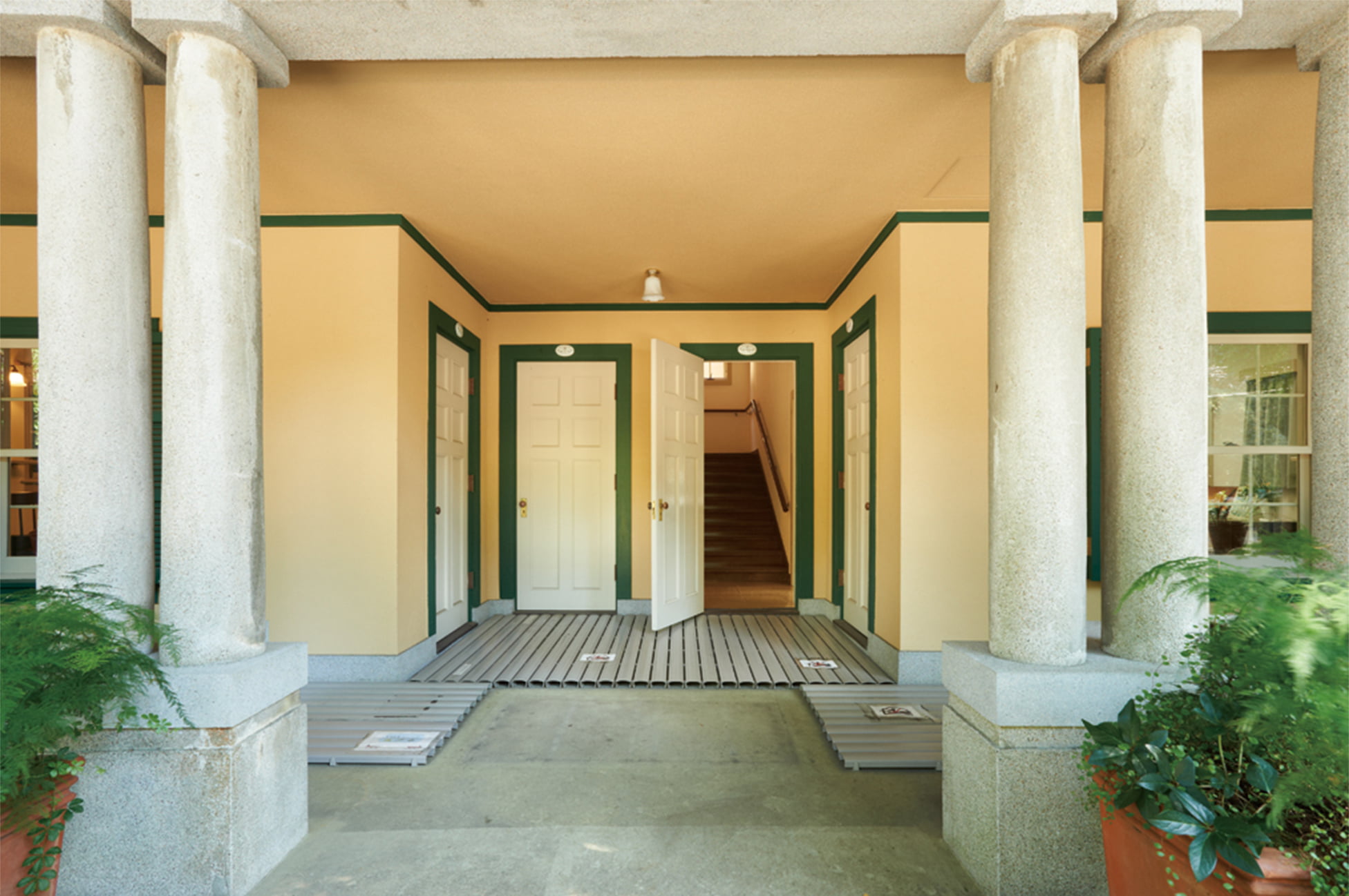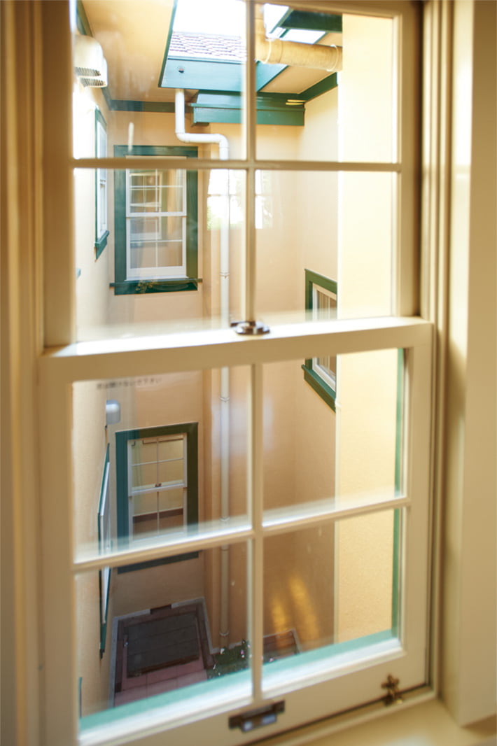 玄関は建物正面のポーチに集められ、ドアを開くと1階の2戸は直接、居間へ、他は2階への階段に続いていた。階段は各戸が独立した住まいになるように、壁で仕切ってあった。建物中央の光庭は各戸の採光と、浴室の湿気を逃がす役割を担った共有スペース。また、暖炉用煙突を上下階の2戸で共用するなど、共同住宅らしい工夫もみられた。