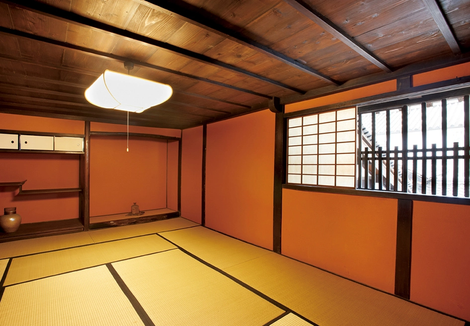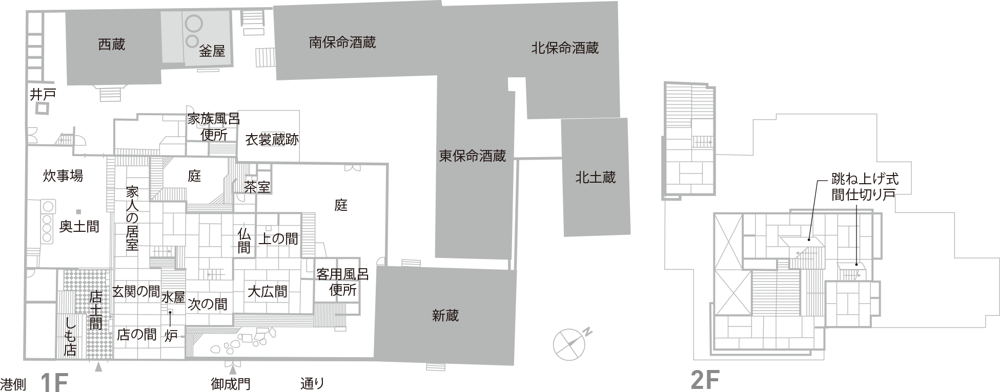 その右奥には接待用の客間などをしつらえ、1階の部屋数は17室にのぼる。当時、茶道は大商家の主人の嗜みであったので、一畳台目の茶室だけでなく随所に水屋や炉を設け、全客間で茶を供した。土間の網代天井も茶道ゆかりの趣向とされる。「大広間」「上の間」は書院造風の客間で、家人用居室の多くが紅殻壁であるのに対して白に近い壁色である。