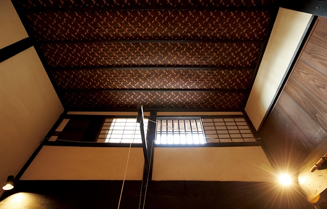 客が訪れる土間の網代天井。一方、私的空間の奥土間はすだれ天井とし、茶道のもてなしに通じるしつらえを施している。