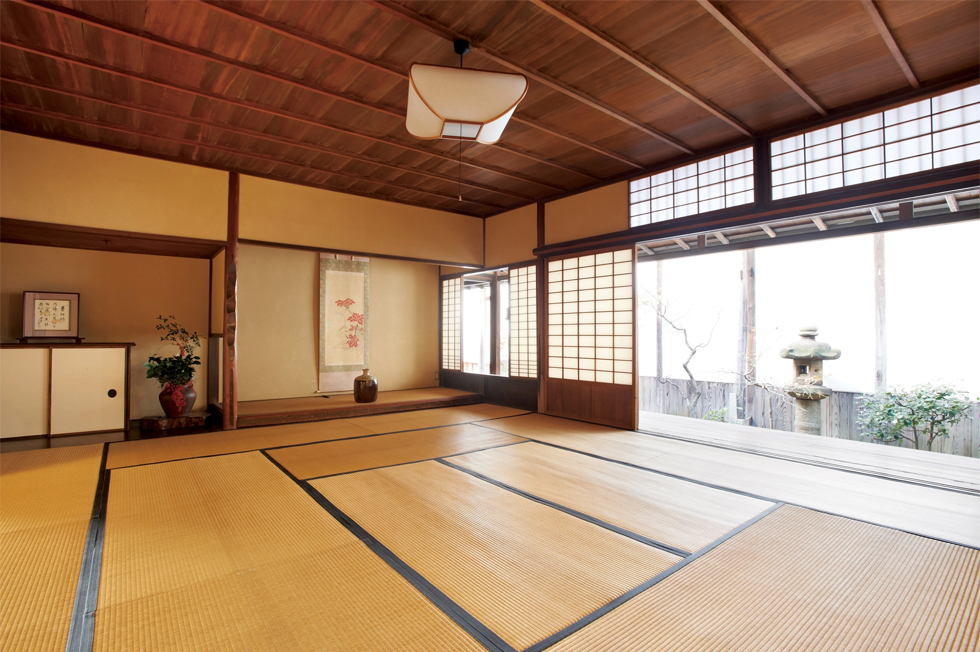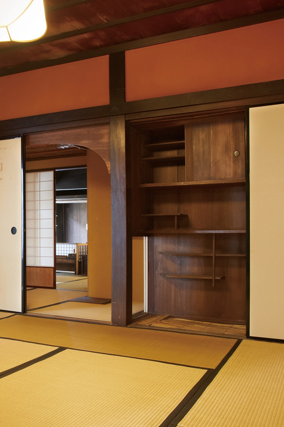 主屋では、瓦と三和土を四半敷きの市松模様にした土間に沿って商売用の「店の間」「玄関の間」、数寄屋造風の家人の居室が並ぶ。