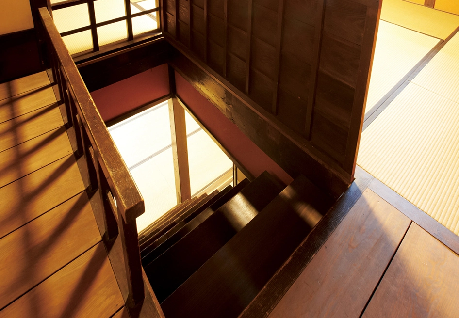 客が寛げるよう、階段に跳ね上げ式の間仕切り戸を設置。