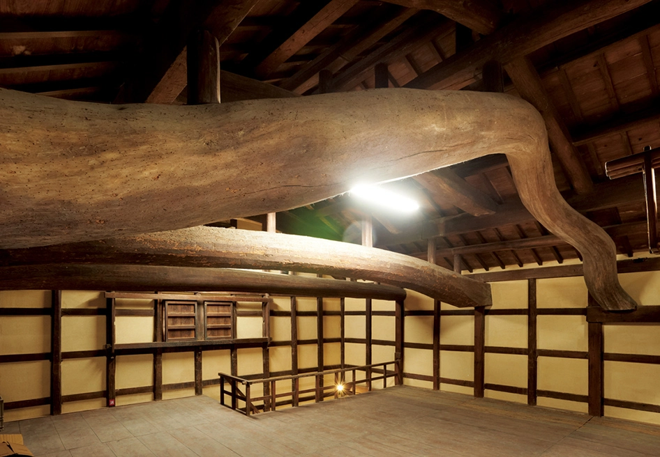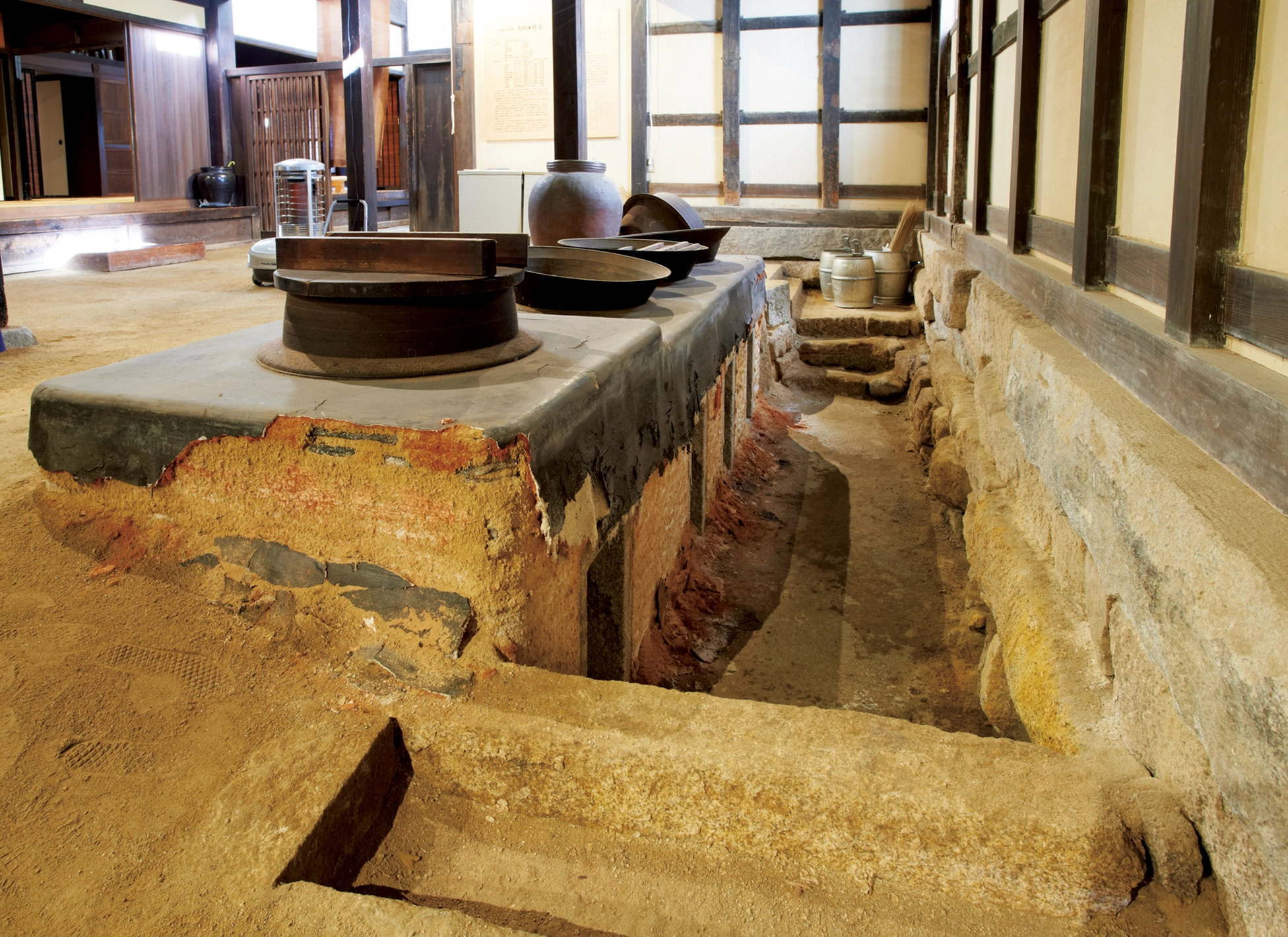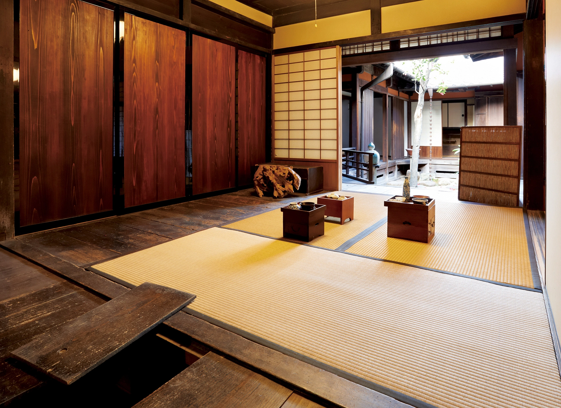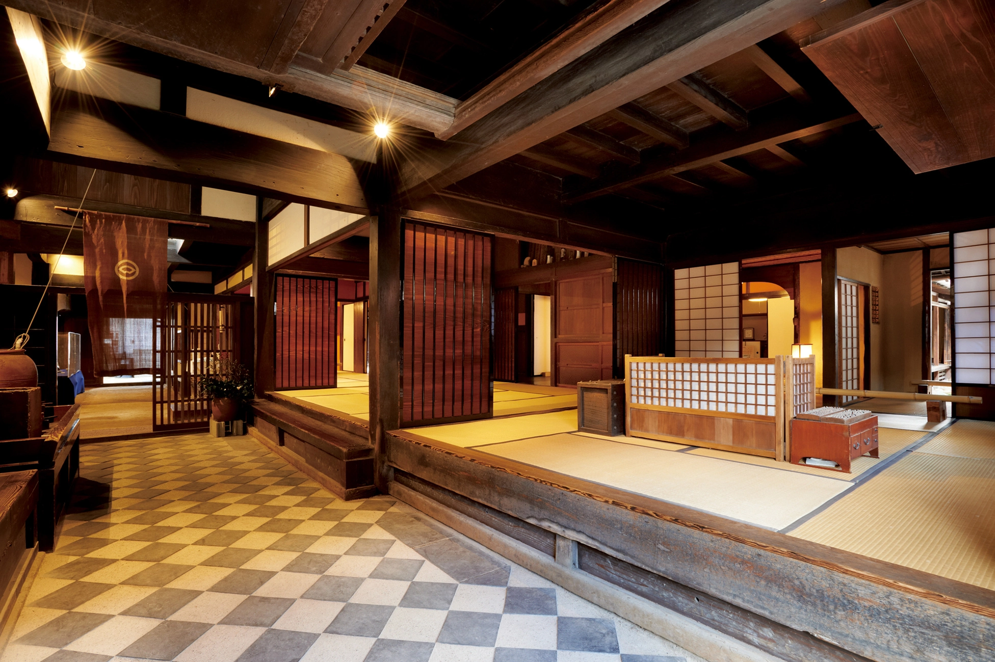 保命酒を商った店の間(写真手前)や玄関の間が並ぶ主屋1階。松煙で染め付けた梁や柱は松材。モダンな意匠の土間や、縦格子を漆塗りした舞良戸が目を引く。