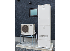 災害時に停電した際に自家発電&自家消費できる創蓄連携システムや、HEMSがパッケージ化された「新ゼロパッケージ」と、エコキュート、エアコンをご採用。