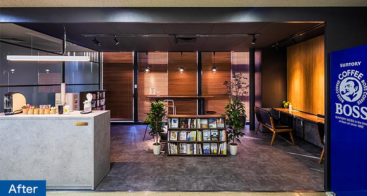 「従業員の自己啓発のために、本棚を置いている場所があったのですが、あまり活用がされていませんでした。ちょうどデッドスペースがあったので移動させることになったのですが、せっかくならみんながもっと利用しやすい場所づくりをと思い、どんな場所が欲しいかアンケートを取りました。すると、『休憩スペースが欲しい』『落ち着いたカフェのような空間が欲しい』などの声が寄せられたので、本があって、コーヒーも飲めて、ひとりでも気軽に休憩できて、人ともコミュニケーションが取れる、そんな場所にリニューアルすることになりました。」