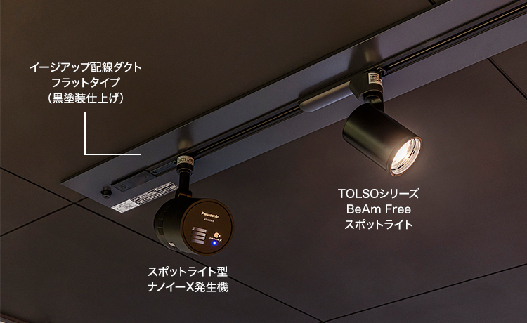 今回は、照明器具とともにスポットライト型ナノイーX発生機もご採用いただきました。「スペースをとらないところが良いと思い採用しました。人が集まる場所なので空気清浄機は必要だと思っていましたが、床に置くとスペースを取ってしまいますよね。黒色で天井やスポットライトとなじんでいるところも気に入っています。」