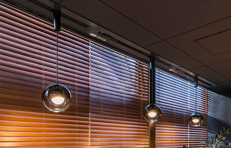 窓際にはLEDフラットペンダントをご採用。球体ガラスの美しい光沢と陰影で上質感を演出。