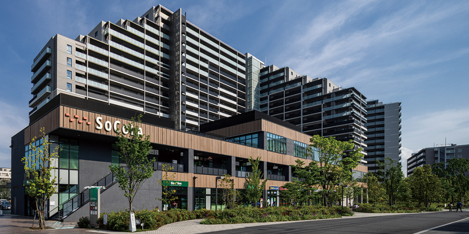 箕輪町開発計画ではA街区、B街区、C街区に分け、それぞれに当社の集合住宅「プラウドシティ日吉」のレジデンスⅠ・Ⅱ・Ⅲを配置。いずれも地上20階建で、総戸数が1,318戸に上る大規模免震分譲マンションで、2020年3月より順次入居を開始しています。敷地内には小学校、食品スーパー、保育園、サービス付き高齢者向け住宅などがあり、全世代型の住環境となっています。