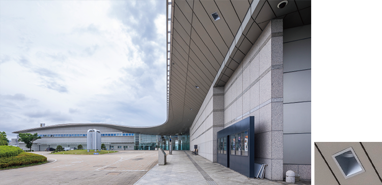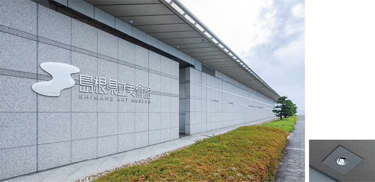 同美術館は2005年より指定管理者制度※を導入。株式会社SPSしまね様が指定管理者となって管理されています。支配人である羽根田様は次のようにお話しくださいました。「照明器具が建築物と極力調和をはかるよう、軒下ダウンライトの枠を指定色で塗装しました。展示室内のダウンライトの枠も、器具の存在感を抑えるため、天井と同化する色にとことんこだわりました」。