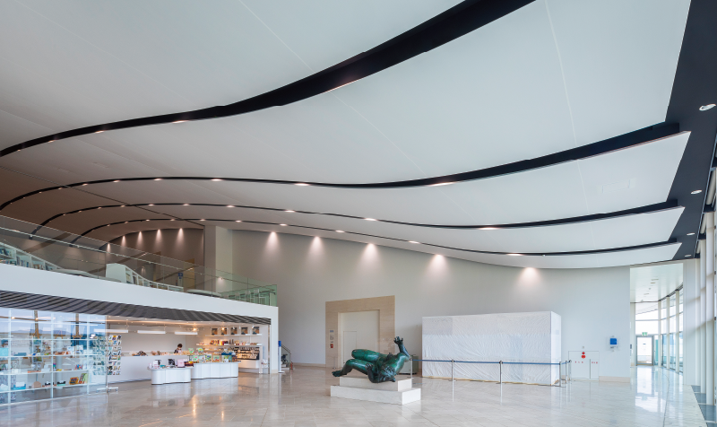 さらに今回、2021年より1年の歳月をかけて、同美術館のシンボルであるさざ波をイメージしたロビー天井の耐震化工事と、空調改修、照明改修を実施。軒下、展示室、ホール、バックヤード等にパナソニックのLED照明をご採用いただきました。