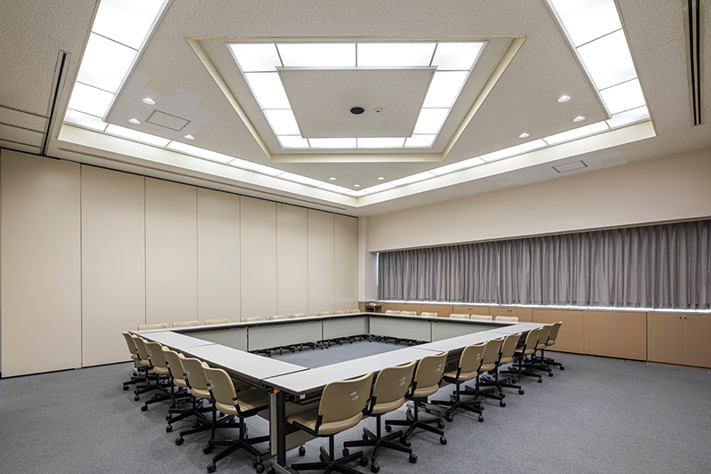 会議室はLEDスクエアベースライトを組み合わせ意匠を表現。